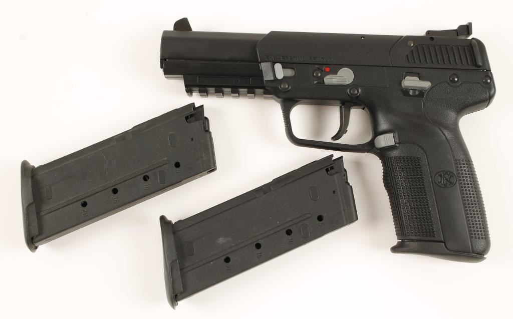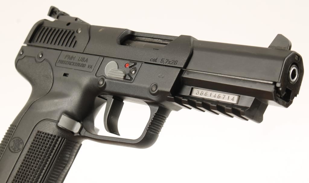 Belgium made single action semi automatic 5.7x29mm pistol by Fabrique National. Features a 4.75 stainless steel barrel with chrome lined chamber and bore, steel slide with polymer cover, polymer frame with MIL-STD 1913 accessory rail, checkered grips, ambidextrous safety lever, and reversible magazine release. Includes three 20 round magazines, FN foam fitted case with cleaning kit, documents, tools and gun lock. Finish shows only slight handling wear. Bore is excellent and action is strong. Condition is excellent. ***Modern Firearm***