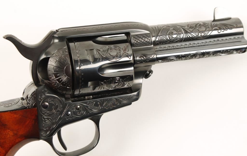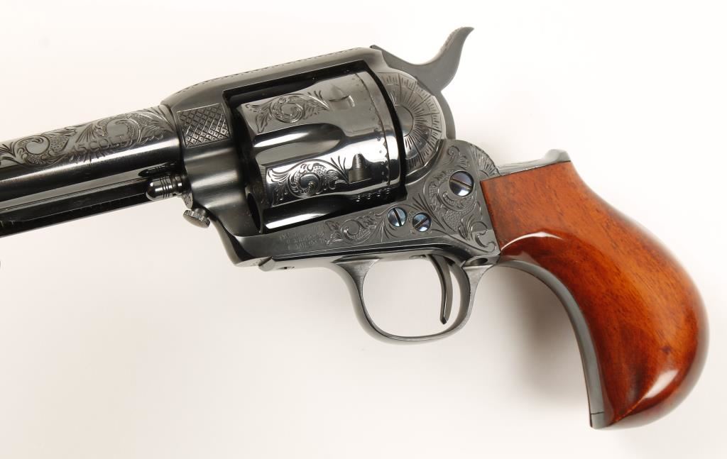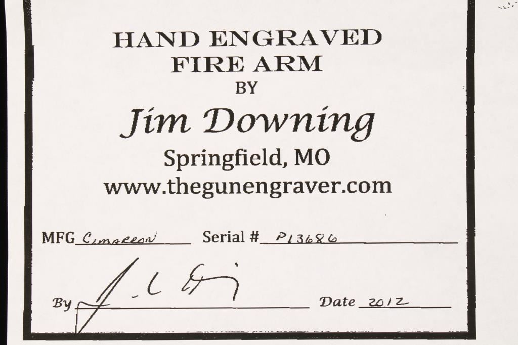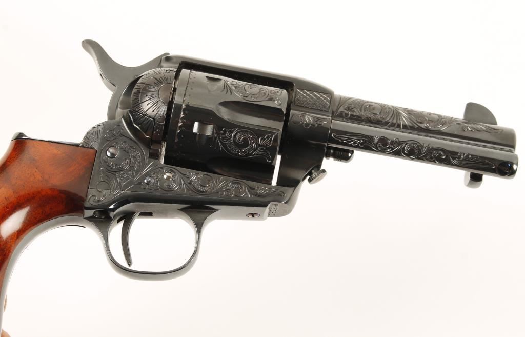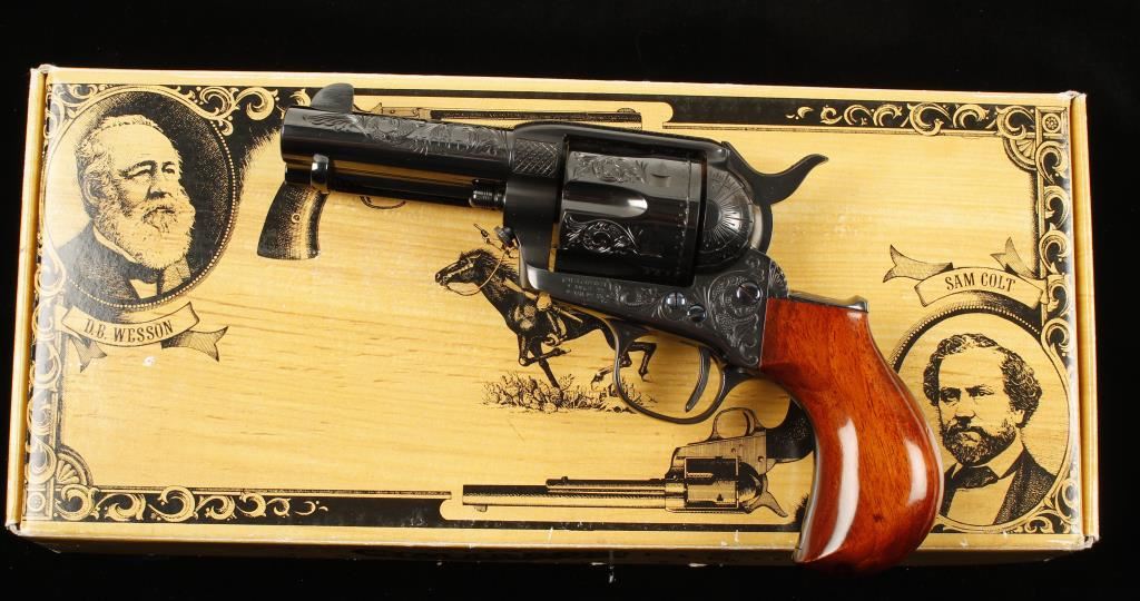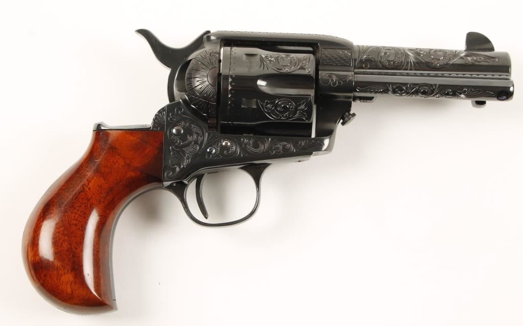 Engraved Italian made six shot single action revolver chambered in .45 Colt, modeled after the 1877 Colt and manufactured by A. Uberti. Custom fully blued finish and fully engraved by well-known artist Jim Downey "The Gun Engraver" and featured in his book of engraving . Features a blued 3.5" engraved barrel, blued engraved cylinder, frame & backstrap, blued hammer, trigger, trigger guard and cylinder pin and one piece birds head walnut grips. Bore is excellent and likely unfired. Condition is like new in box. Includes a letter from Jim Downing that is signed and names manufacture and serial number and date in which he engraved it. ***Modern Firearm***