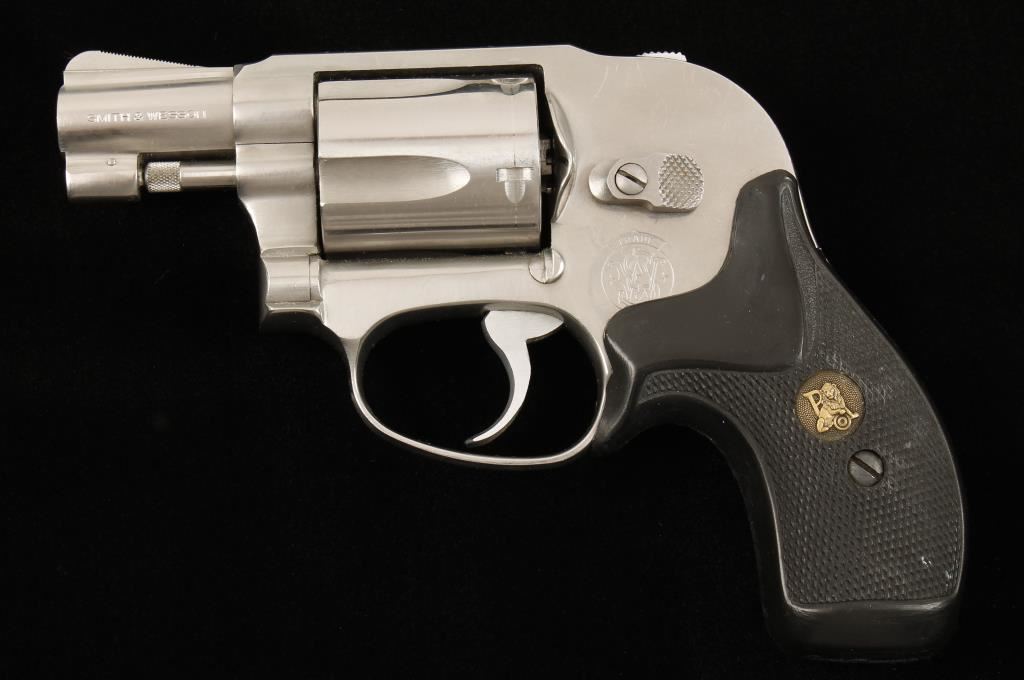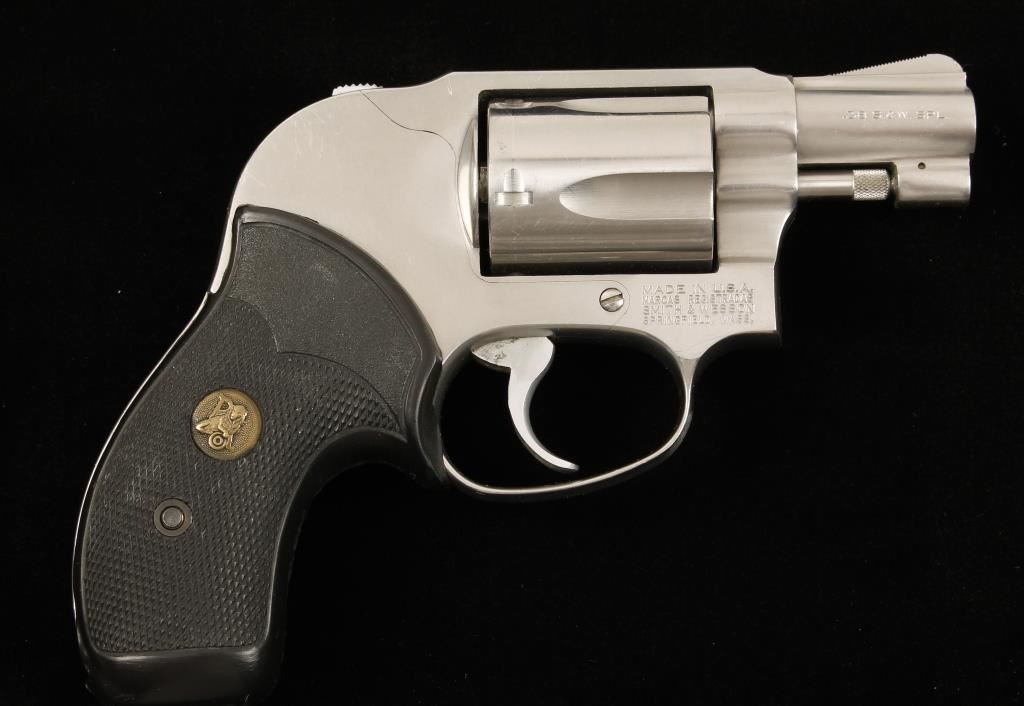 Stainless steel 5-shot double-action revolver with a 1-7/8" barrel, fixed sights, shrouded hammer, document and Pachmayr Compac/Professional grips. Metal finish has many rubs and a few scratches. Bore is shiny with sharp rifling. Chambers are dirty but shiny. Grip is in good shape. Action works well with with good lock-up. Condition is very good. *Modern Firearm*