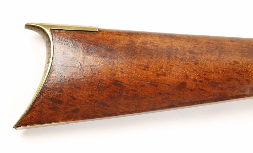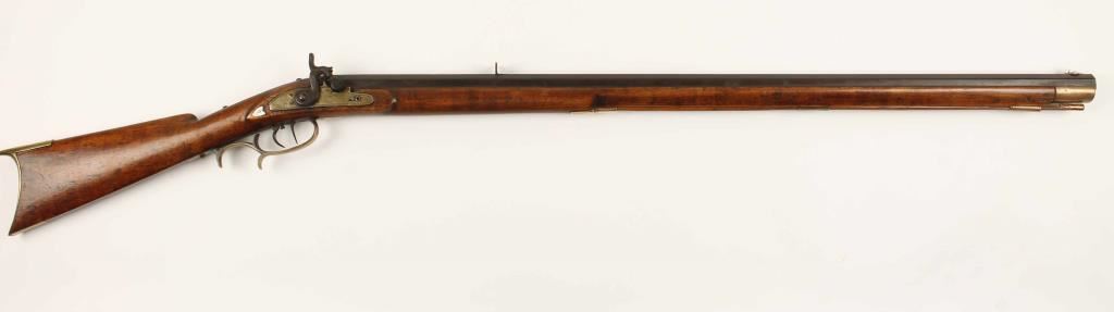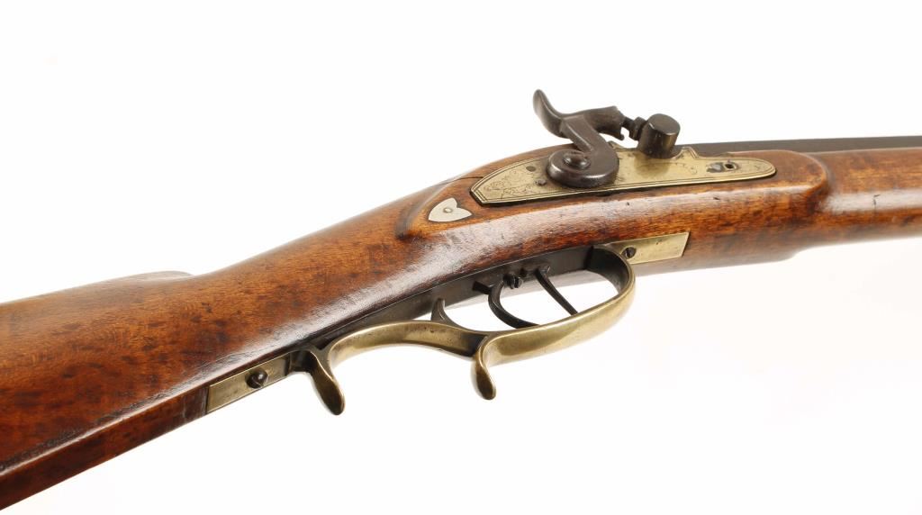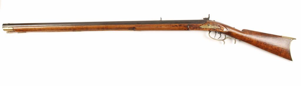 Circa early 1800's L. Hant .30 caliber full stocked Kentucky flintlock rifle converted to percussion. Features a 34.75" heavy octagon barrel, German silver front sight, large v-notch rear sight, dog scene engraved H. Elwell Warranted brass lock. iron hammer, ram rod, brass buttplate, fancy brass trigger guard, double set triggers German silver embellishments and brass furniture. Rifle shows nicely aged dark patina and well kept stock. Action does not currently work, perhaps only needs a spring. Condition is very good as antique. ***Antique Firearm***