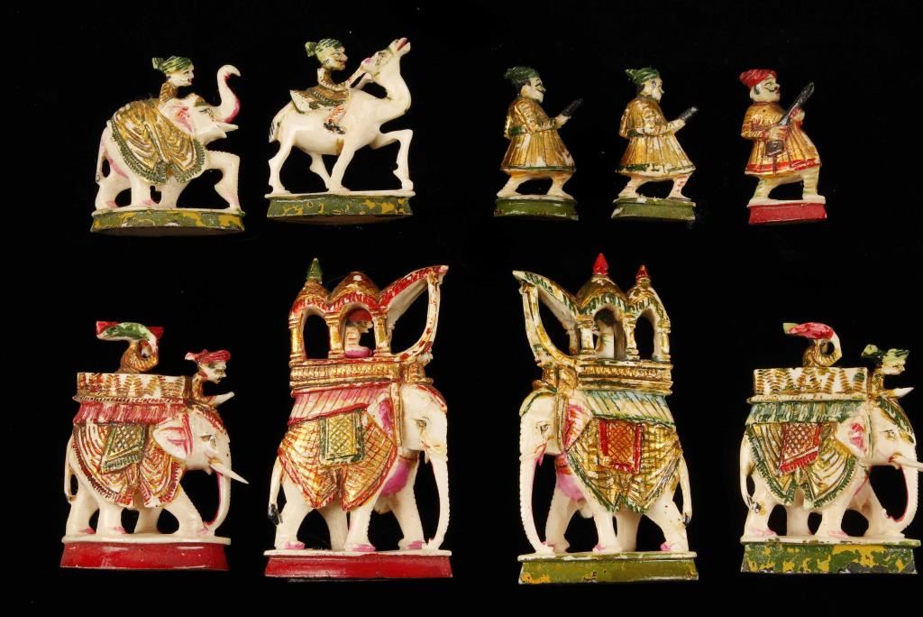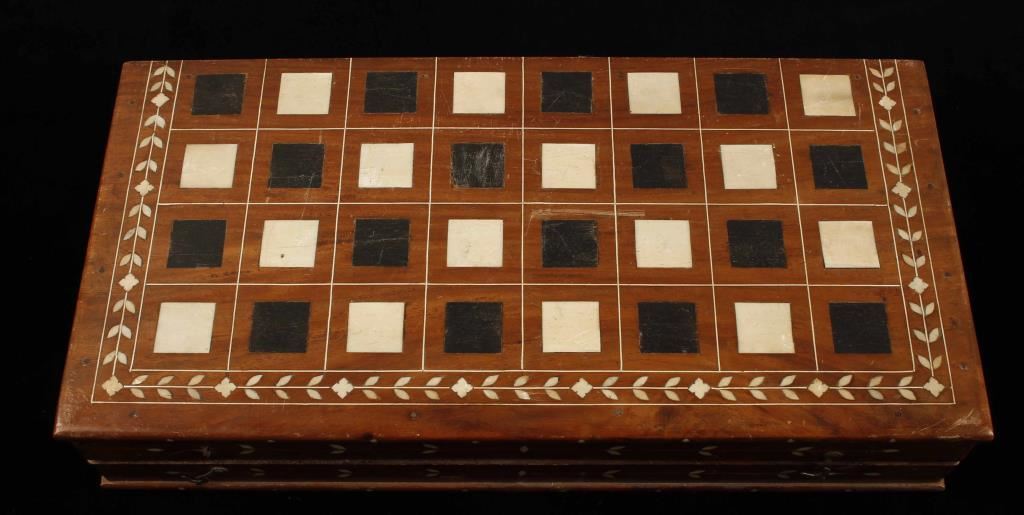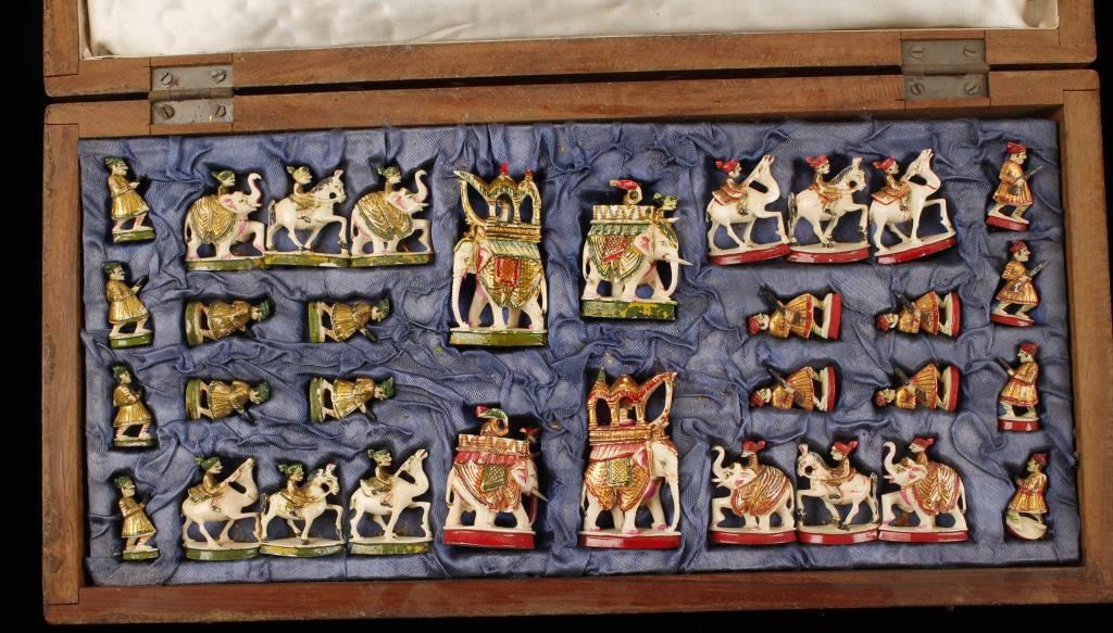 Incredibly intricate chess set. Thirty-two piece hand painted carved ivory chessmen of figural men, camels, horses and elephants. Chessmen are stored in a fitted and plush lined case the opens and becomes the chess board. Case/board is elaborately inlaid with chess and floral pattern. Two of the pawns have breaks, both on the barrels of the rifles and one at the feet also. Condition is very good as antique. ***Only For Sale in Arizona***