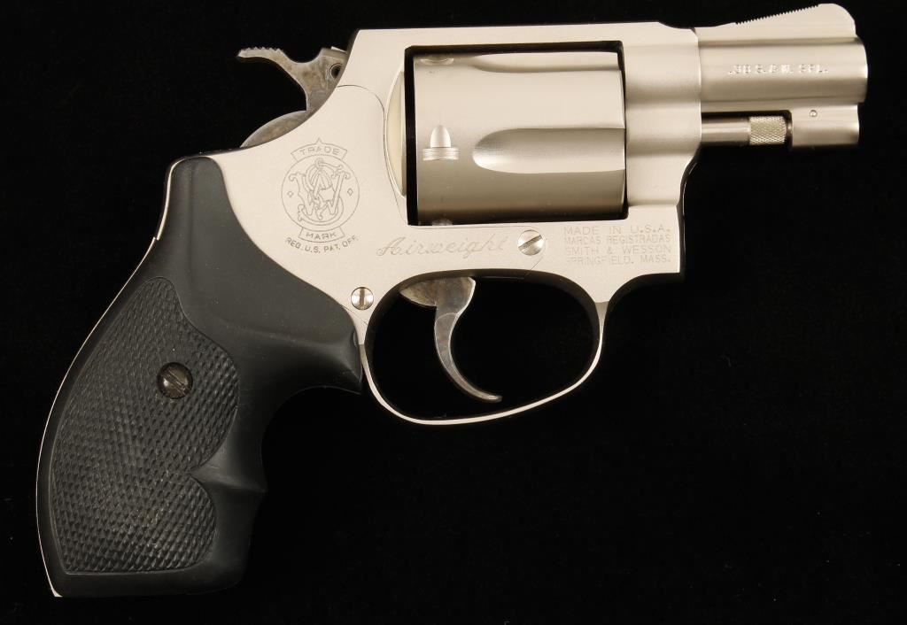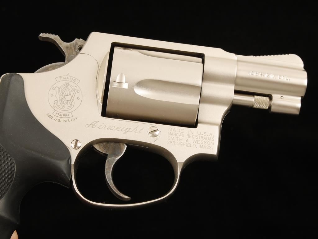 Matte stainless steel and alloy, case-colored 5-shot double action revolver (Airweight) with a 1-7/8" barrel, fixed sights and rubber grips. Metal finish on the steel cylinder and barrel shows just a drag line. The alloy frame has one ding on the topstrap edge. The case-coloring still shows good color. Bore is bright and shiny with sharp rifling. Chambers are bright and shiny. Action works well with good lock-up. Condition is excellent. *Modern Firearm*