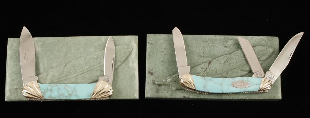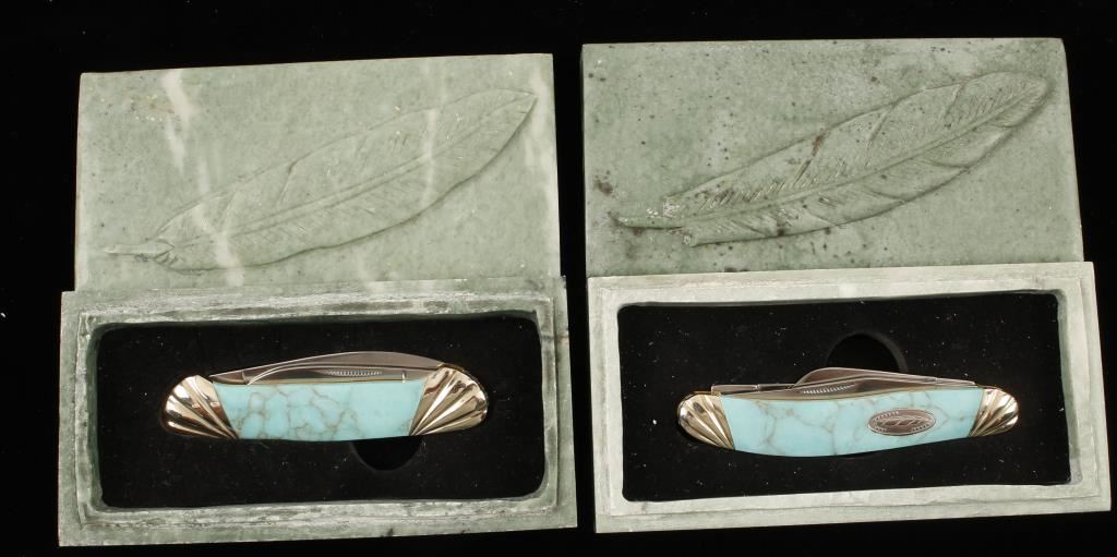 Made in China. Imitation Turquoise Series. "Canoe" 3-5/8" closed and 6-1/8" open. "Sowbelly Stockman" 3 3/4" closed and 6-1/4" open. Each includes a jade box with feather relief artwork on lid and factory packaging. Condition is excellent.
