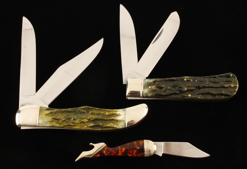 One single blade and two 2-blade knives. "China" is etched on the blades. One is a "Gal Leg" (MR208) 1-blade 3-3/16" closed and 5-1/4" open with celluloid scales. Second is a "Swell-Center" (MR194) 2-blade 4-7/16" closed and 8-1/16" open with green jigged bone scales. Third is a "Swell Center Folding Hunter" (MR191) 2-blade 5-1/4" closed and 9-1/4" open with green jigged bone scales. All have factory boxes and two and three have zippered pouches also. Condition is excellent.