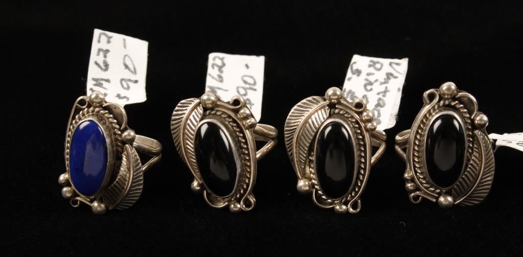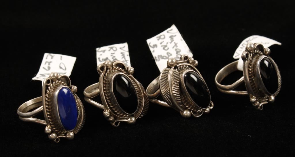 3 Of Which Have Onyx Stones And One Lapis Stone Set In Sterling Various Sizes. From the Charlie Myers estate noted dealer, collector and friend.