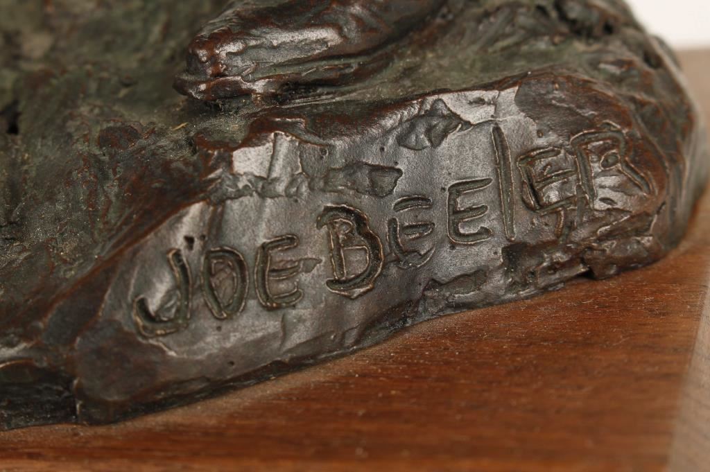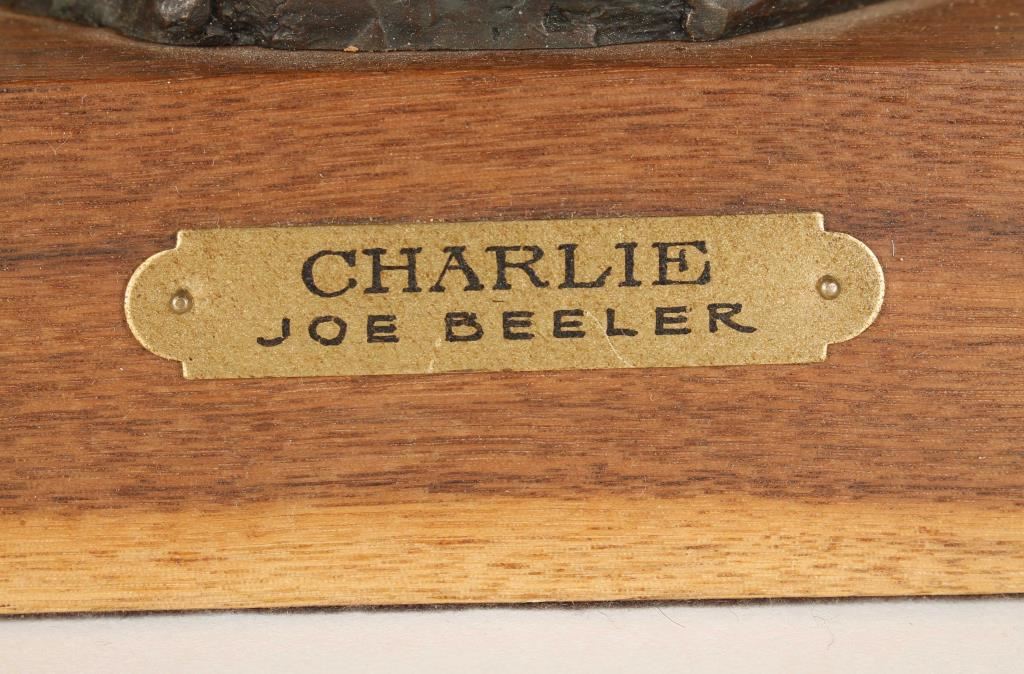 Limited edition bronze #99 of 100 by famous American Western artist Joe Beeler. The bronze portrays Charlie Dye cowboy artist who was a close friend of Joe Beeler and a Co-Founder of C.A. Artists of America. Signed & numbered on a wood base with brass plaque that reads "Charlie Joe Beeler". Measures 16 3/4" overall. In very good condition.