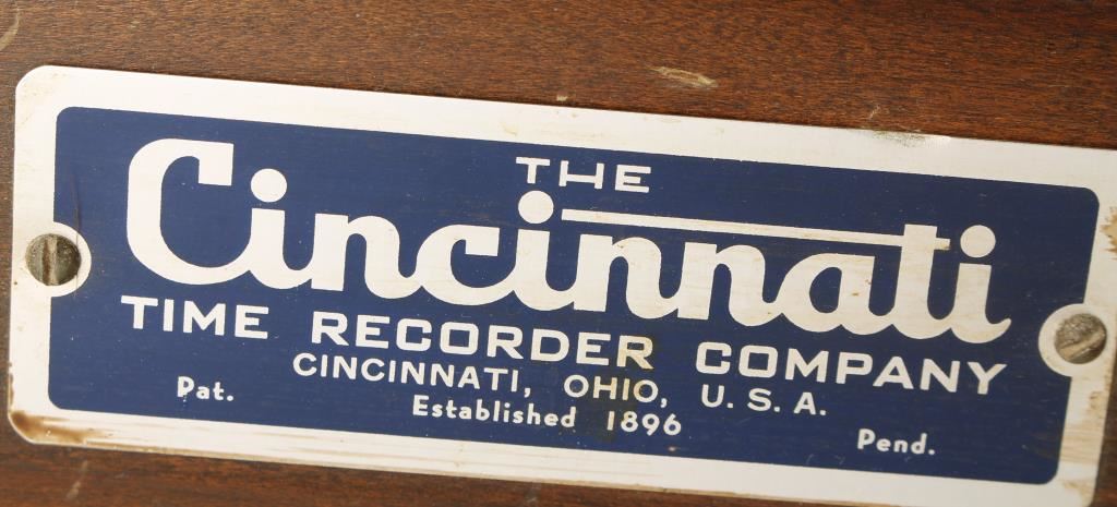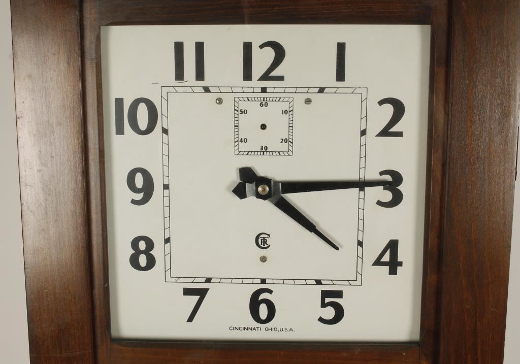Made by the company that produced the first time clock in 1896. Dark finish wooden cabinet with a white square face and large numbers. Also a smaller clock square towards the top that reads off in increments of 10 up to 60. Large round silver metal pendulum. Plate at bottom of clock reads "The Cincinnati Time Recorder Company, Cincinnati U.S.A., Established 1896". Measures 57-1/2"x18"x9". Great Art Deco piece!
