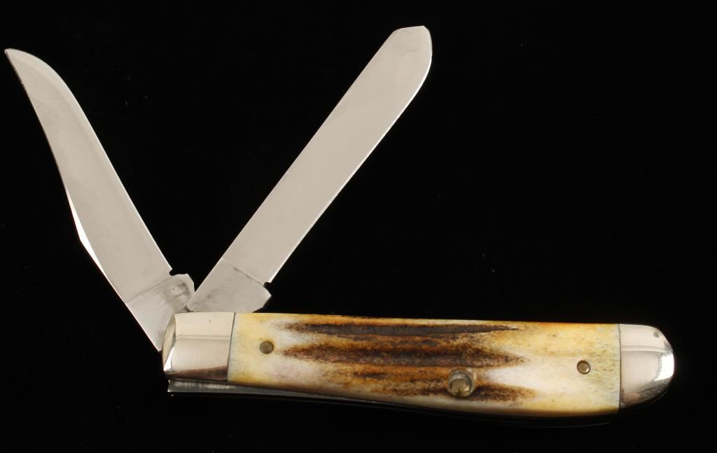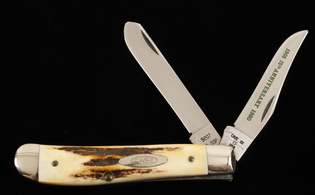 Made in 1980. Stamped " 5207 SP SSP". Handles are Stag. Master blade is 2-3/4" long and has the text "1905 75th Anniversary 1980" applied to it in green. Condition is excellent.