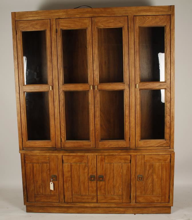 Four upper gallery glass cabinet doors with three section storage on the bottom. Interior glass shelves and lighted inside. Solid pecan wood, medium light distressed finished, 1970s era. Measures 6' 8"x 5'x15". Shipping responsibility of buyer.