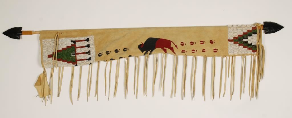Suede Leather piece with beaded geometric design and a painted buffalo with footprints hung on a wooden dowel. Has faux arrows on each side with fringe on bottom. All handmade, great for the western themed home or office.