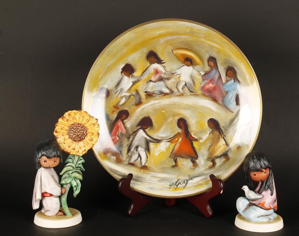 DeGrazia edition "The White Dove" and "The Sunflower'. And a Bradford Exchange Degrazia Plate 1976 First Edition "Children of the World" hand signed by Degrazia and dated 1977 on back in marker. Overall very good condition.