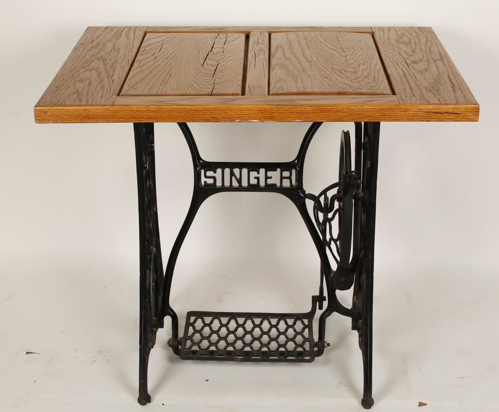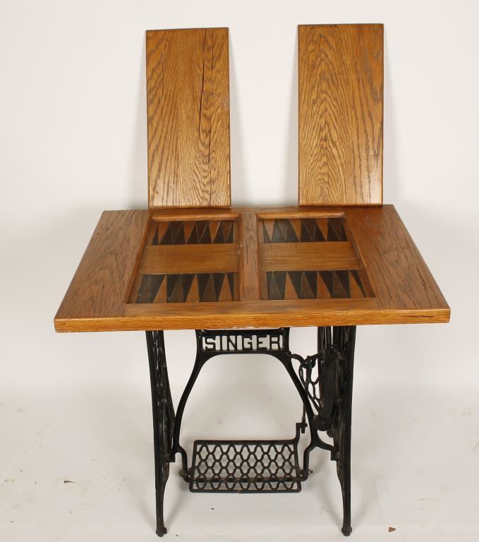 Black wrought iron Singer sewing machine base with wheel and pedal that still move. Sides of base read "The Singer Manfg. Co." and piece between legs reads "Singer". Tabletop is oak with two sections that lift off to reveal a wooden inlaid backgammon table. Shows wear and a few stains and top has some cracks. Measures 34"x30"x26". A great decorator for the game enthusiast!