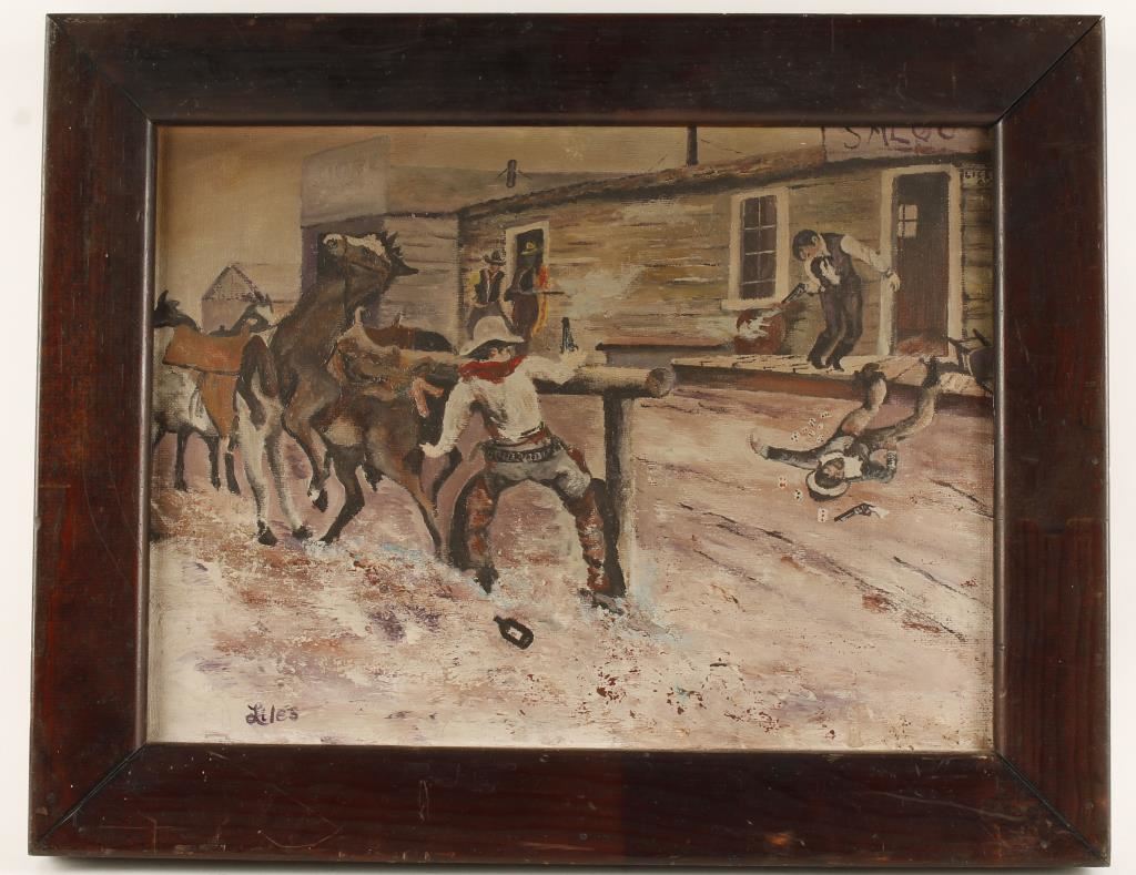 By Liles signed, depicting a cowboy shoot out, 15"x11", in wood frame.