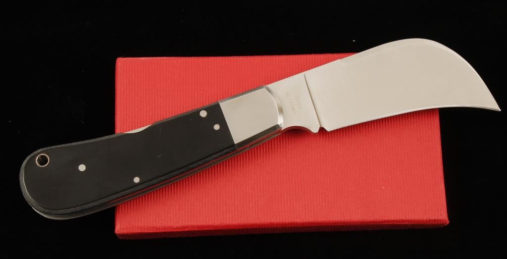 Made in China. Single blade lockback. 4-3/8" closed and 7-7/8" open lengths. Black Rucarta scales. Includes factory box and nylon belt pouch with shipping sleeve. Condition is excellent.