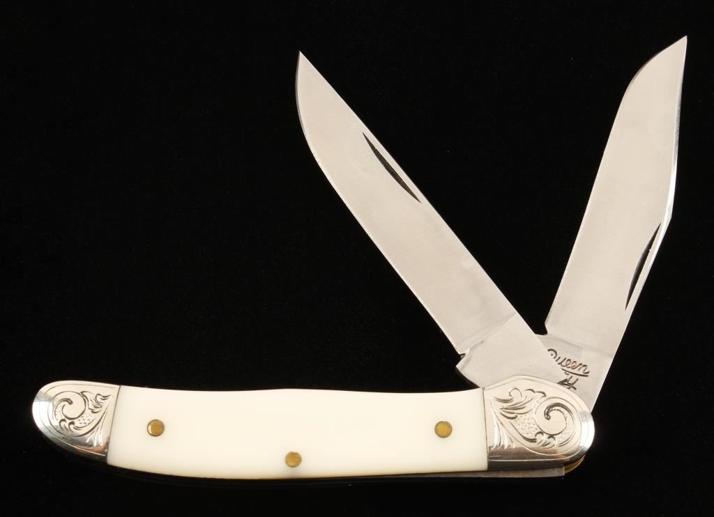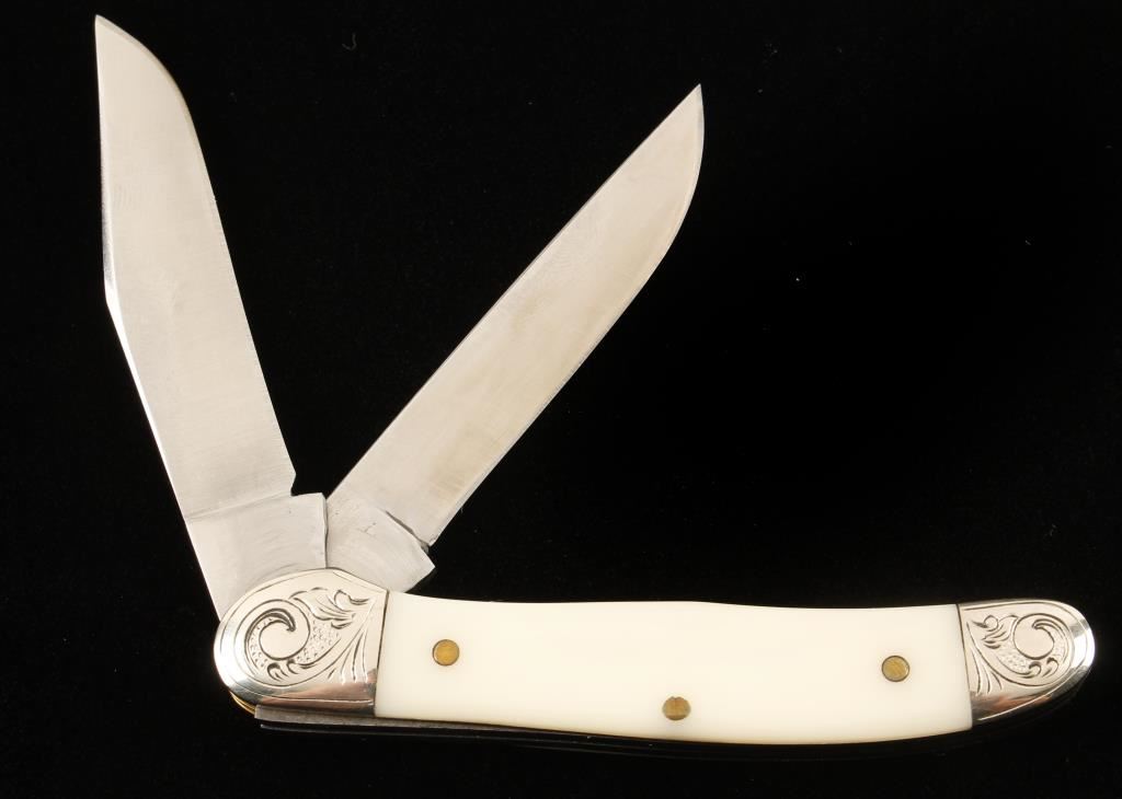 3-3/4" closed length. 6-1/2" open length. Scales are white composition. Nickel steel bolsters are engraved. Master blade is stamped "Queen City". Includes factory box and tissue paper. Condition is excellent.