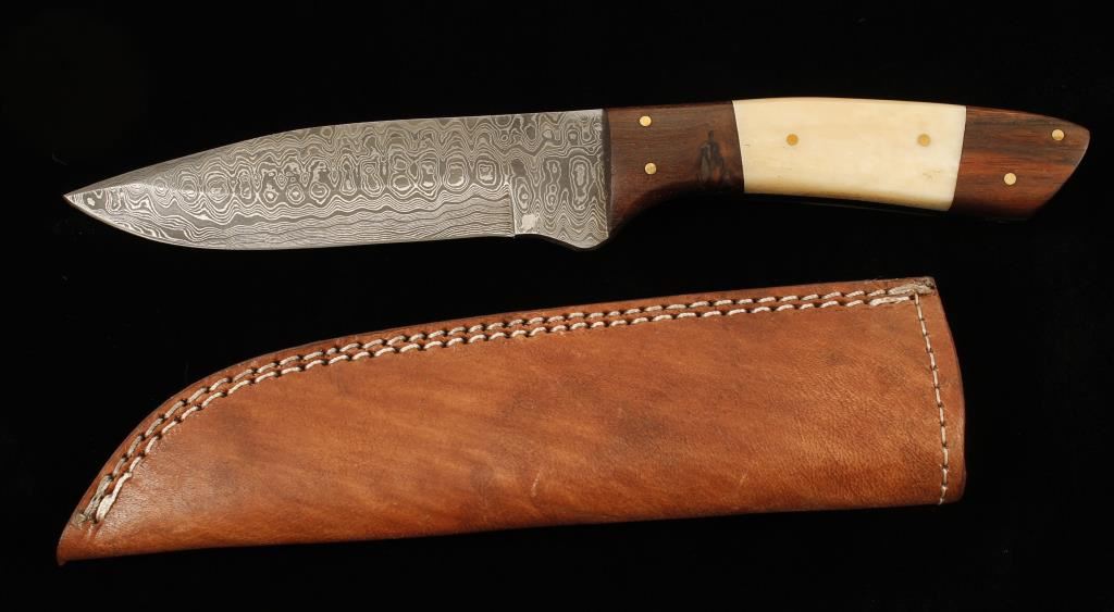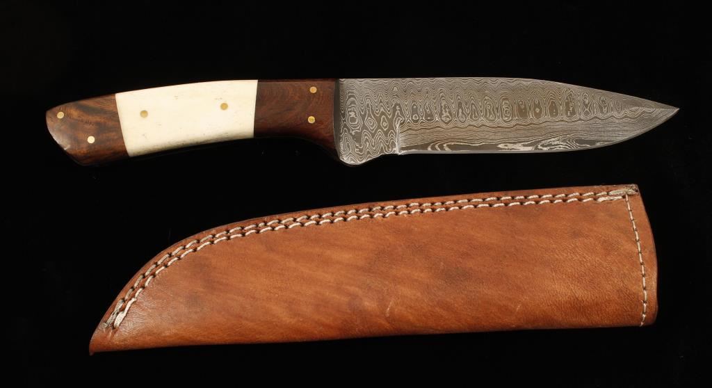 Walnut Wood and Olive Wood Handle. Blade is approx. 5.5" and the handle is approx. 4.5" Comes with a genuine leather sheath. Comes with a genuine leather sheath. Custom made by Kevin Johnson, Vista, CA.
