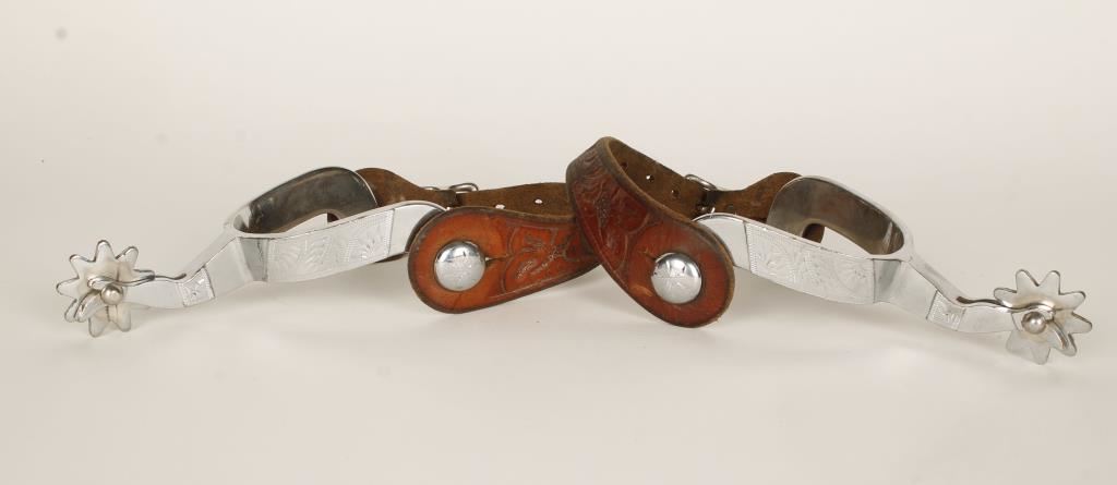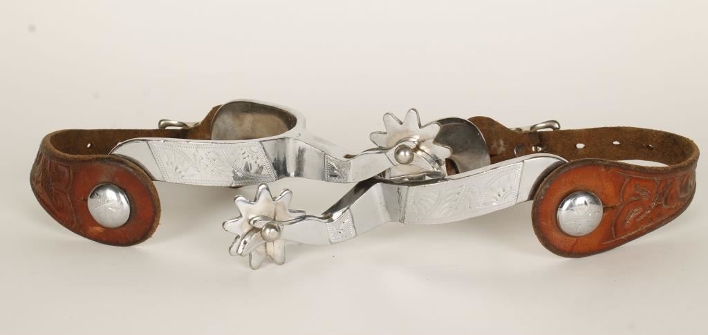 Engraved design, marked with an R inside a horseshoe, with leather spur straps.