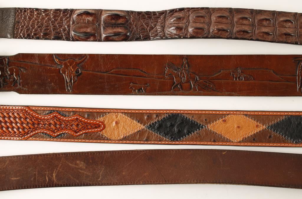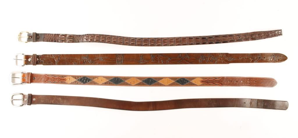 1 very nice crocodile belt made in Austrailia (35"), 1 brown leather belt embossed with an Indian scene, 1 plain brown belt and 1 hand tooled leather belt accented with ostrich hide (34").