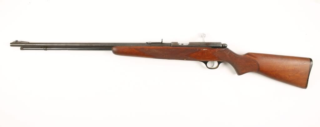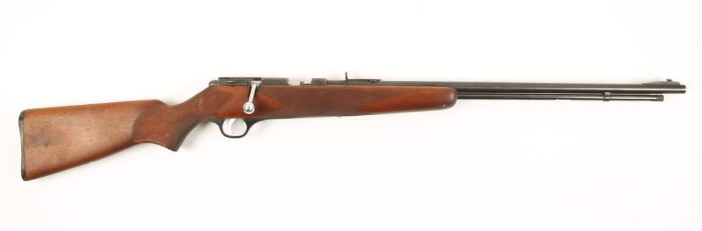 Blue bolt-action tube magazine fed rifle with a 24" barrel, hand checkered wood stock, Marble's full-buckhorn rear sight (missing the elevator), ramp gold bead front sight (missing the hood) and a plastic buttplate. Metal finish shows fading, freckling, edge wear and some surface rust. Bore is mirror bright with good rifling. Action works but if the trigger is pulled with the safety on the striker will subsequently fall if the safety is moved to the fire position. Wood has scratches, gouges, rubs and cracks. There are 2 holes from sling swivel studs. Buttplate has scuffs and small scratches. Condition is fair. *Modern Firearm*