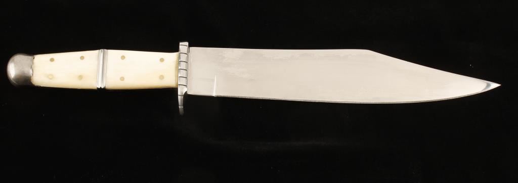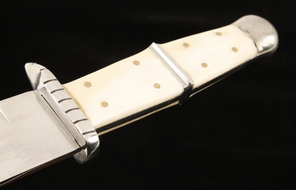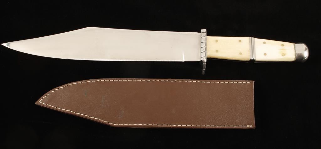 15-1/2" overall length. Possibly full-tang although welds seem apparent. Four piece bone scales. Steel pommel, hand guard and blade. Blade is 9-15/16" long by 1-3/4" deep. Includes leather sheath with no belt loop. Condition is very good.