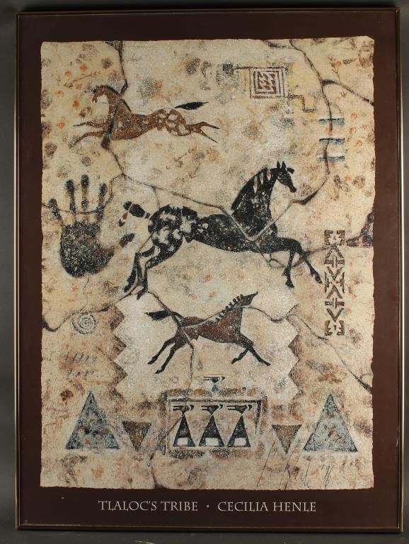 Depicts cave painting of horses, geometric symbols and a hand print on a stone wall with cracks in it. Signed lower right corner "C. Henle '96". Measures 27-1/4"x36-3/4" in metal frame.