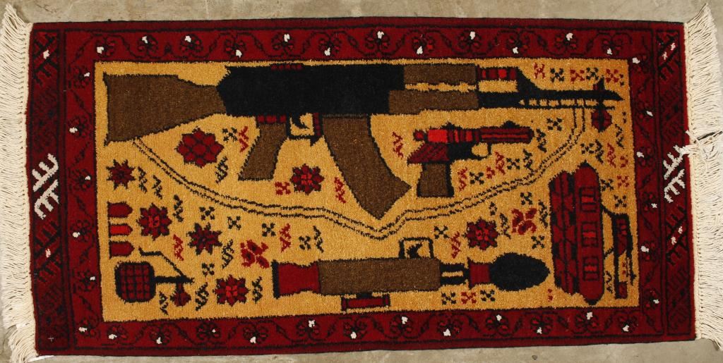 2 of same designs AK-47, bomb and pistol woven design in red and brown tones. Measures 14.8x'3.4', good condition.