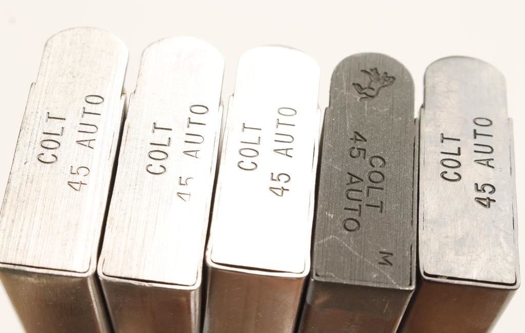 All metal construction single stack 8 round magazines marked "Colt 45 Auto" 5 blued and 3 stainless. Stainless Colt magazines have "2 3 4 5 6 7 8" round indicators. Includes one unmarked stainless magazine of similar quality. Nine magazines in all, all in very good condition.