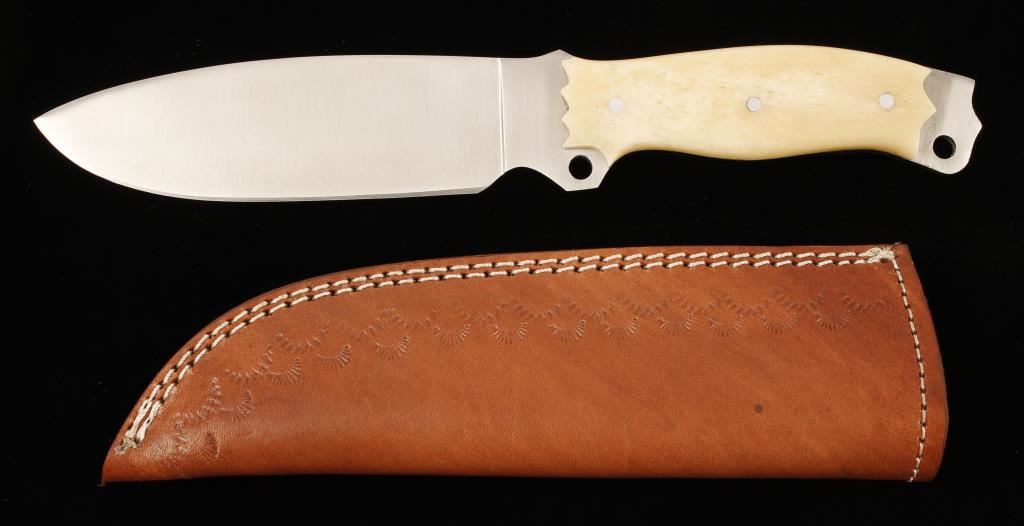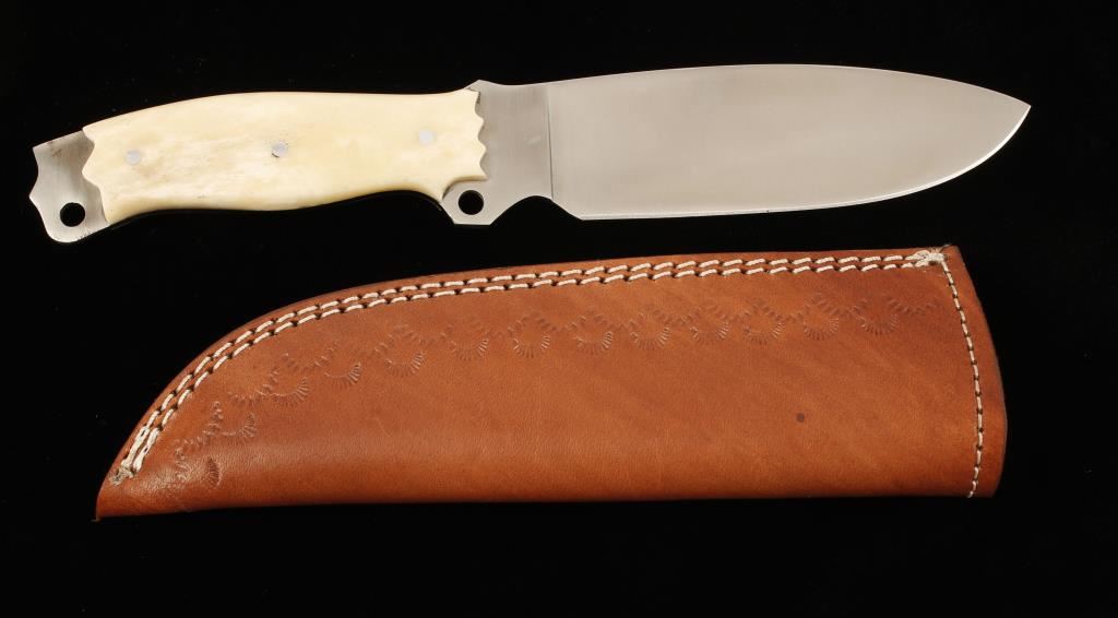 Deer Bone Handle. The blade is approx. 5.5" and the handle is approx 4.5". Comes with a genuine leather sheath. Custom made by Kevin Johnson, Vista, CA.