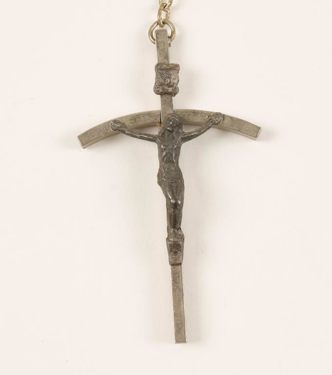 Shades of blue,green and purple opalescent shiny beads with silver medal medallion and crucifix that measures 2-1/4" long.