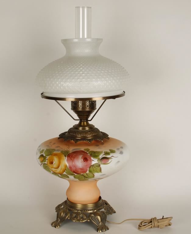 Milk glass Hobb Nail Shade. Base has handpainted rose motif with brass hardware in working condition.