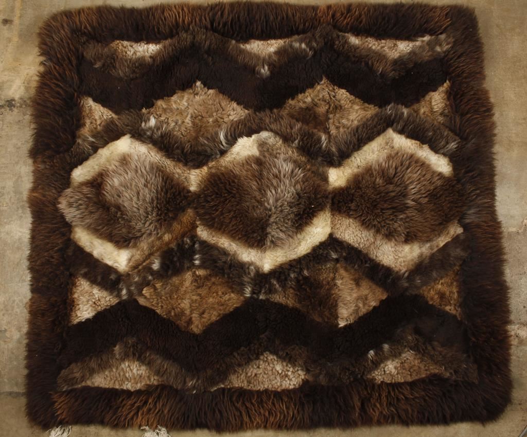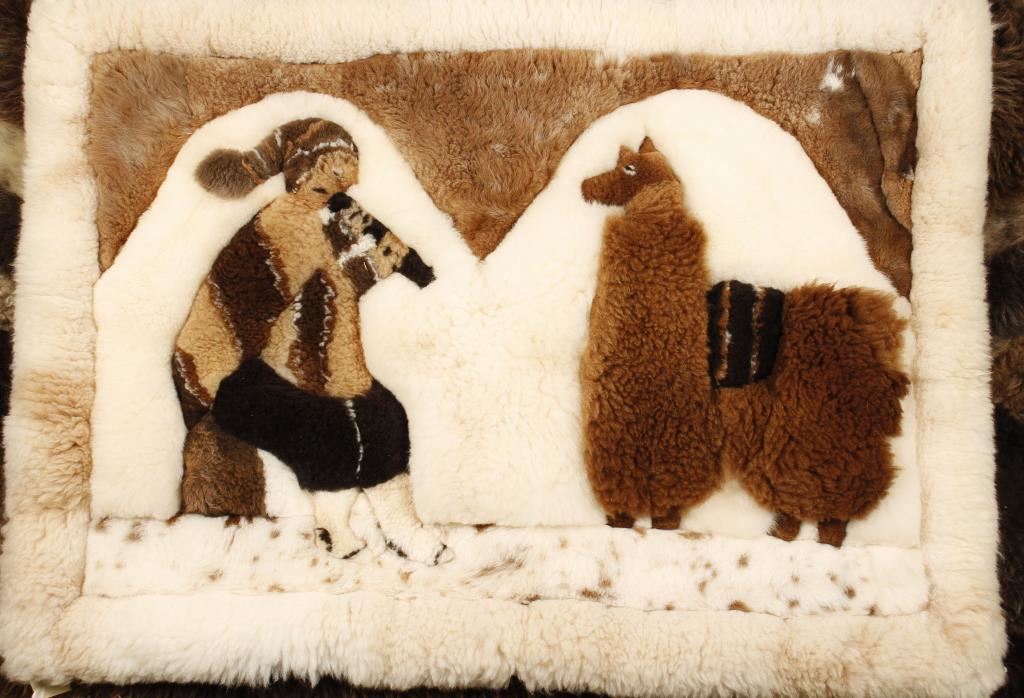 In shades of brown. Includes one other South American llama fur rug with figural designs in white and brown.
