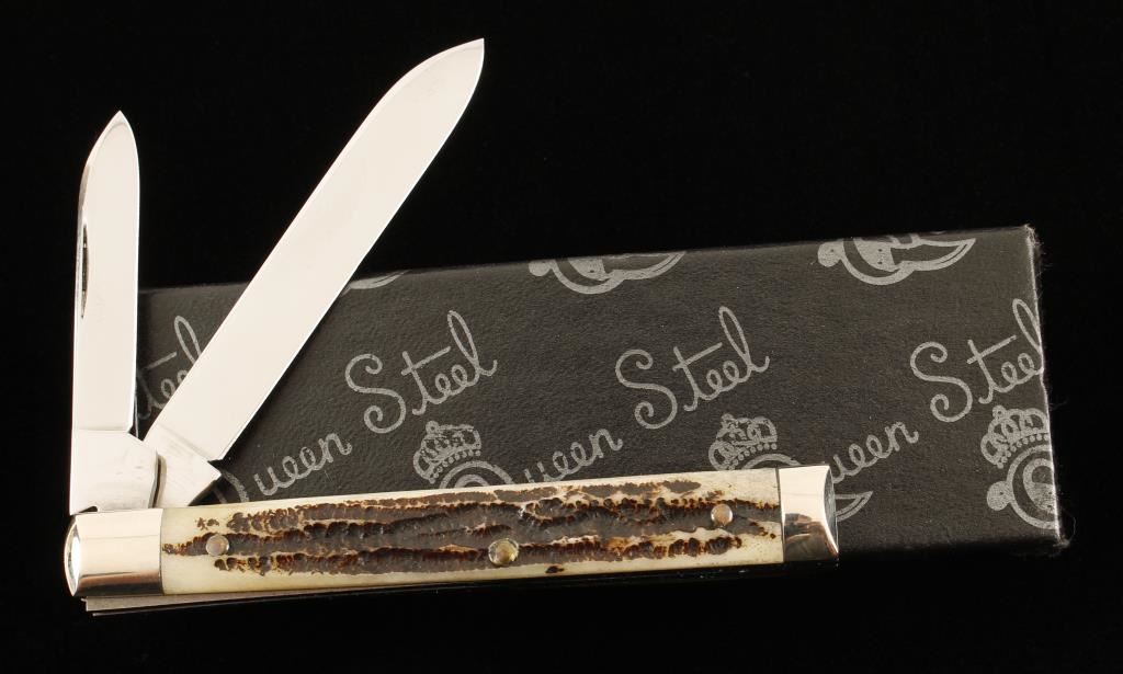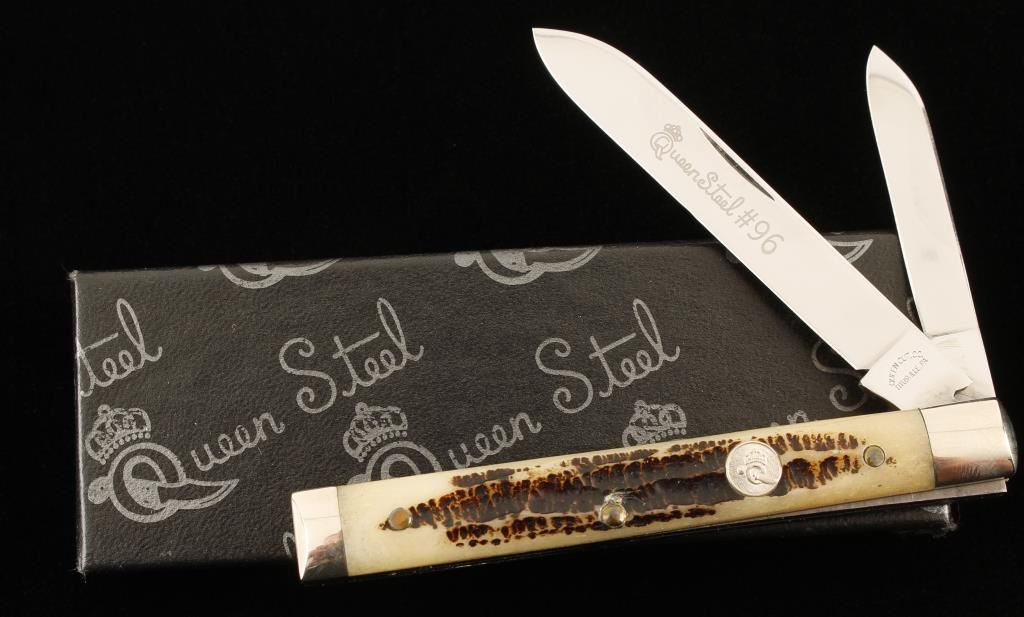 Made by the Queen Cutlery Co. of Titusville, PA. Scales are carved Stag bone. Open length is 6-9/16" and closed length is 3-5/8" Master blade is etched with "Queen Steel #96" and stamped with "Queen Cut. Co." Brass liners and nickel steel bolsters. Includes factory box with tissue paper. Condition is excellent.