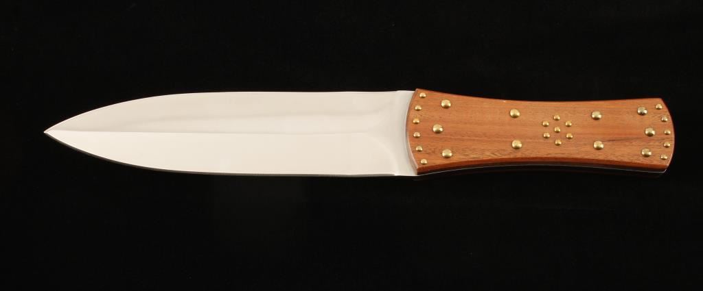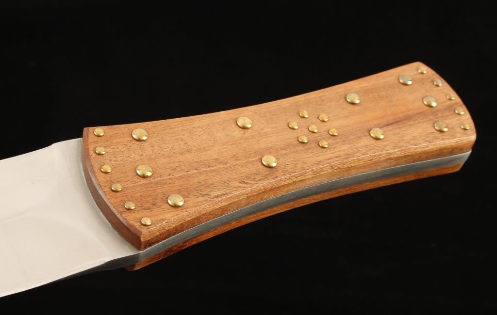12-1/4" overall length. Hardwood scales with many large and small rivets or tacks. Spear point blade is 7" long and 1-3/4" wide. No sheath. Condition is excellent.