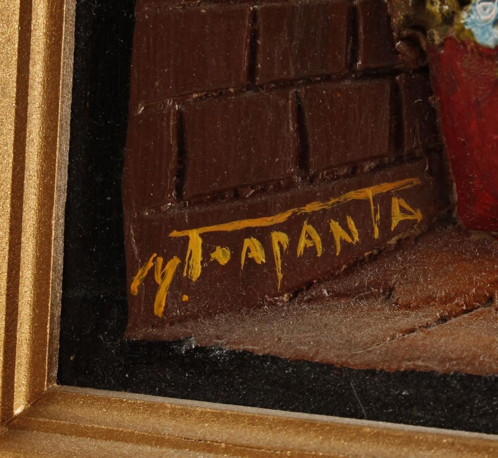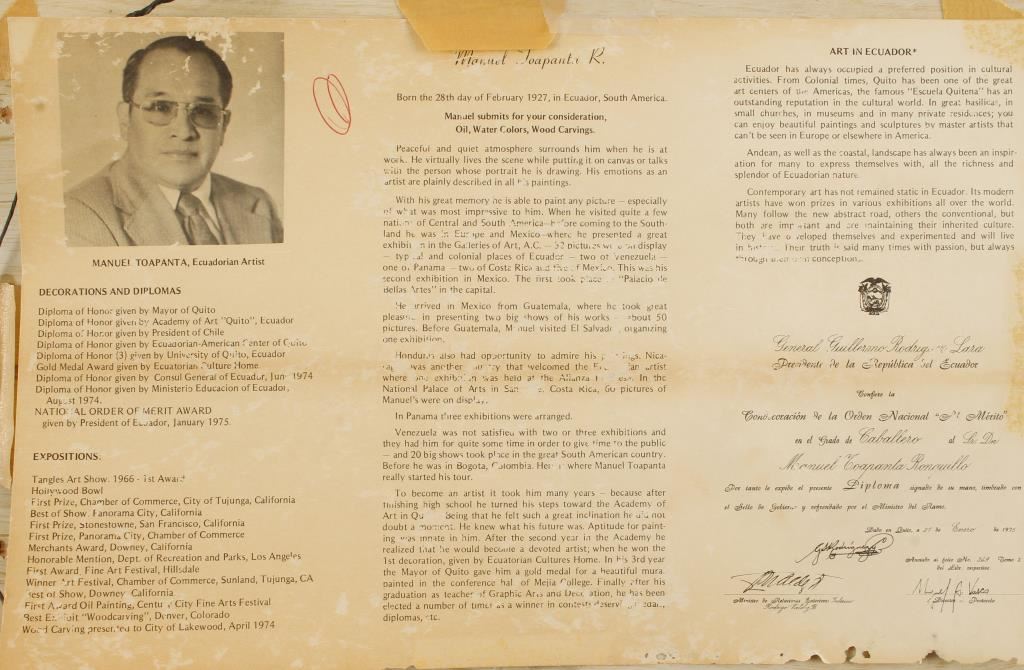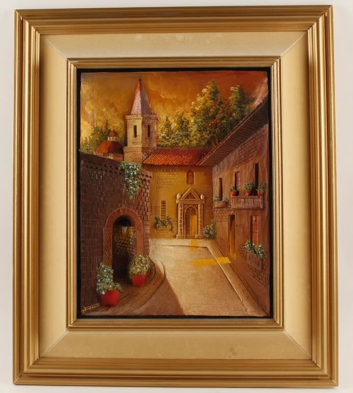 by Manuel Toapanta an Ecuadorian artist, depicting a street scene, signed lower left hand corner, image size is 15X12 in gold frame.