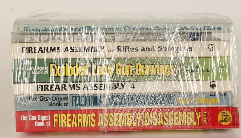 NRA assembly guides for rifles, shotguns, pistols and revolvers, Gun Digest assembly books for revolvers and shotguns, a Gun Digest exploded long guns book, a Stoeger Exploded Views book and a Triple-K Encyclopedia Reference Catalog of Auto Loading Guns.
