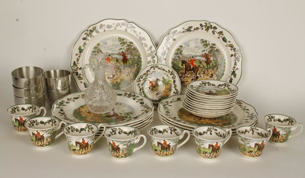 Etruria England with English hunting scene 11plates, 10 cups, and more. Some condition issues.