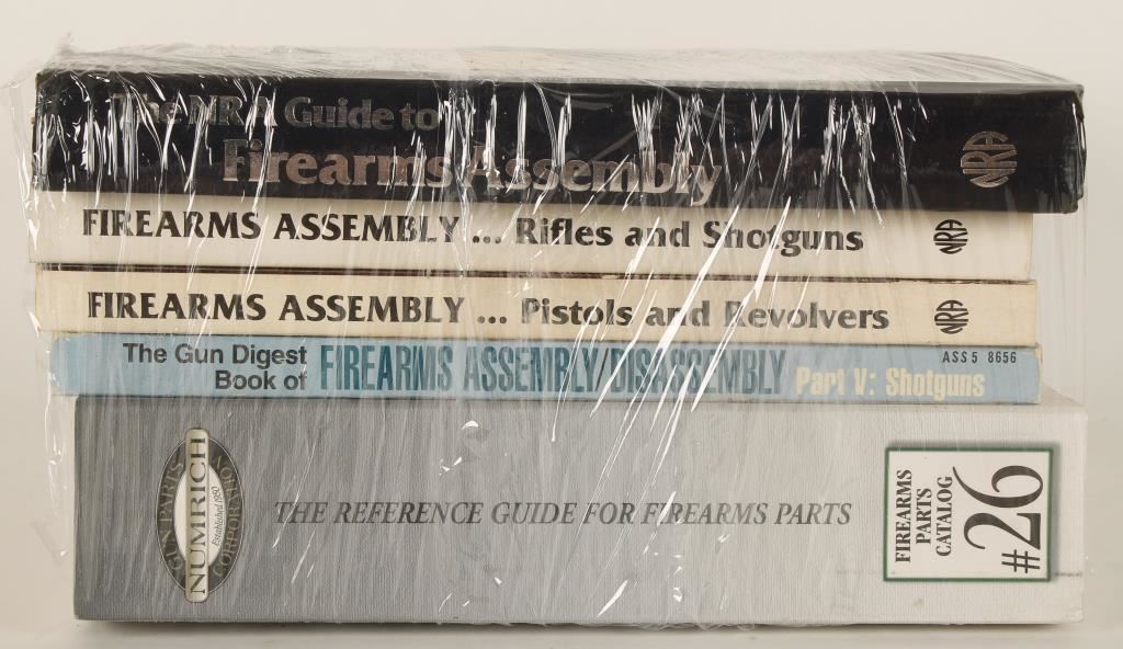Three NRA assembly books, one Gun Digest shotgun assembly book and one Numrich Gun Parts catalog. The hardcover NRA Guide to Firearms Assembly has loose binding.
