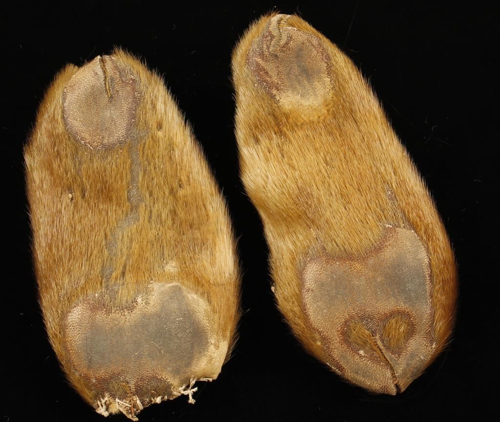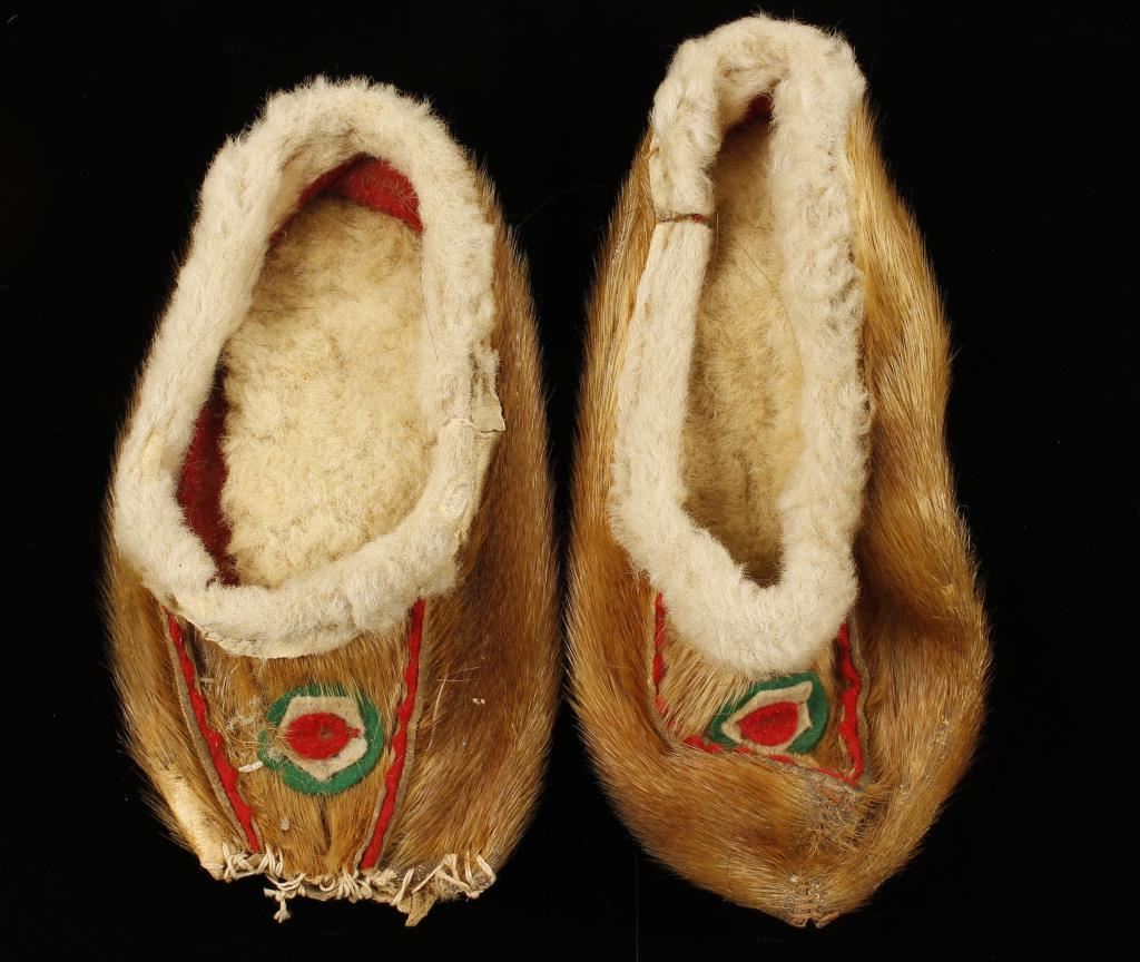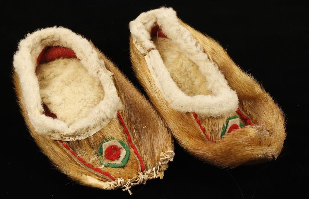 Fur lined moccasins accented with green, red and white felt. Damage to front on one of the moccasins shows an old repair with string. Fur is missing in high wear areas on underside of both moccasins. Condition is good as antique.