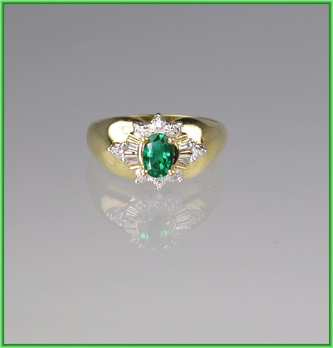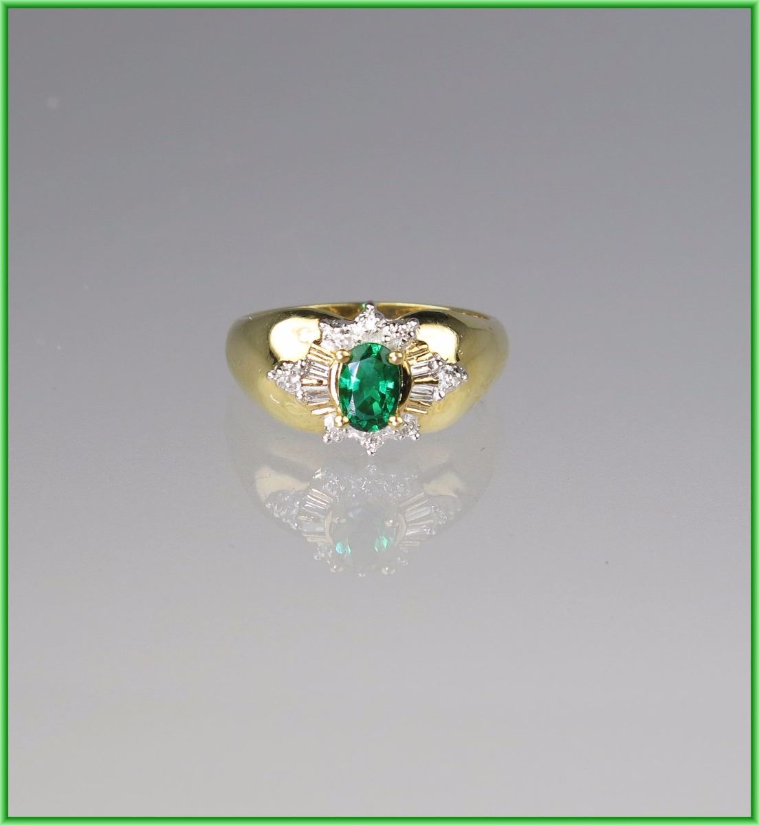 Oval created emerald accented with 12 baguette and round cut Diamonds weighing approx. 0.20 carats set in 10 karat yellow gold.