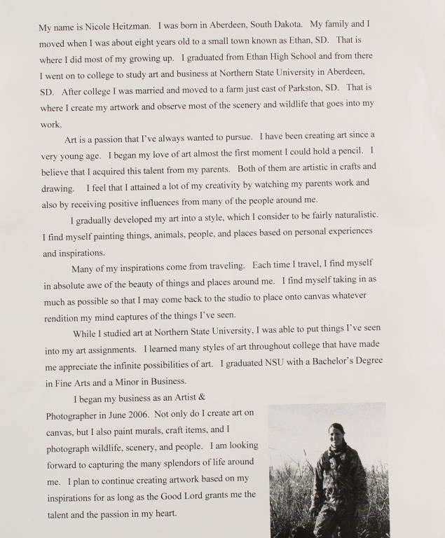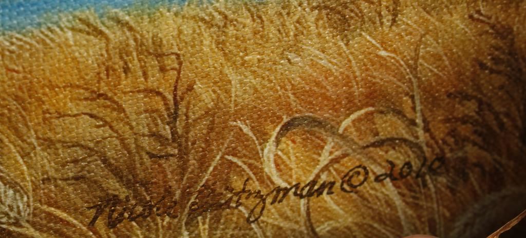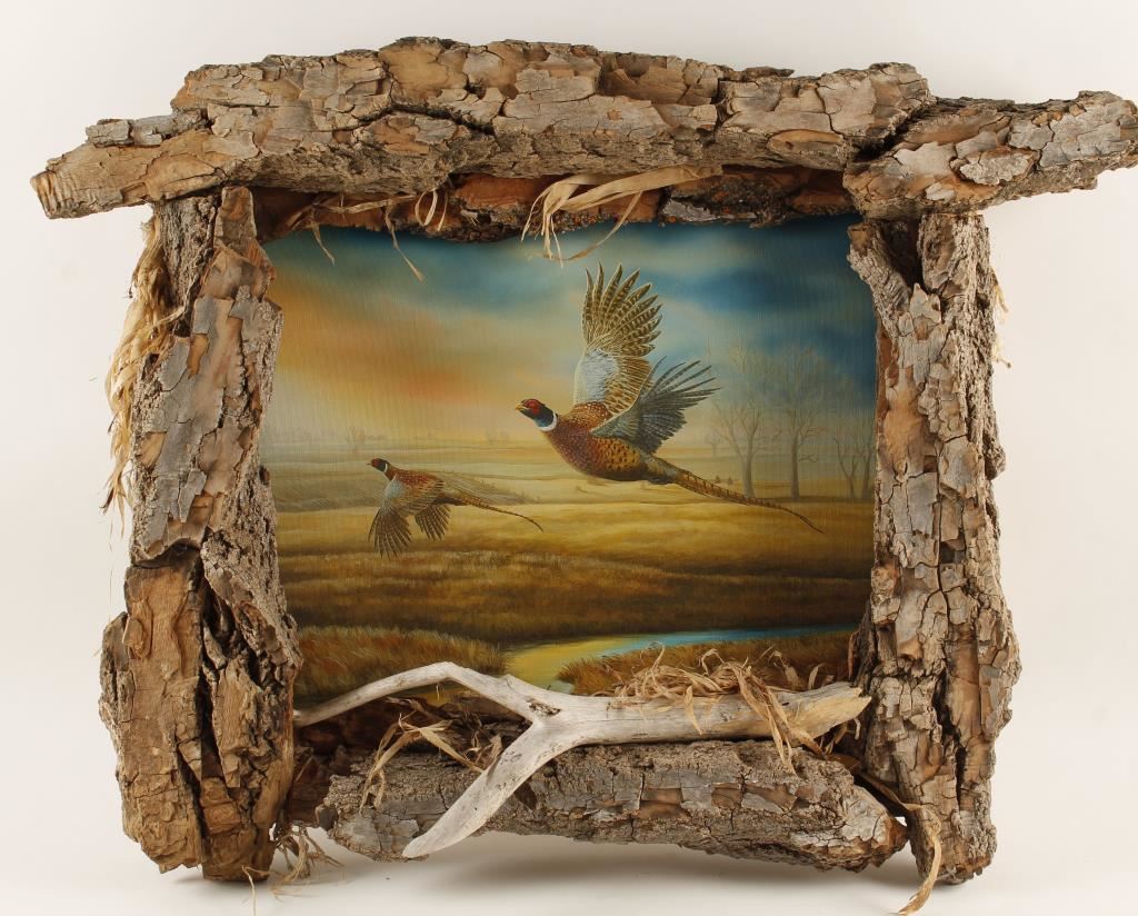 Nicole Heitzman artist, entitled "Pheasant Creek". Artist's proof on canvas. $286.15 Original price from Prairie Breeze Gallery, Mitchell, SD. Image measures 17"x14", hand signed 79/100 in rustic bark frame.
