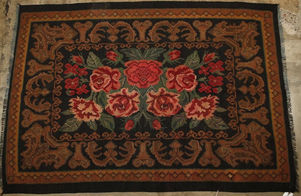 Large floral pattern with black background. Measures 4.4'X6'.