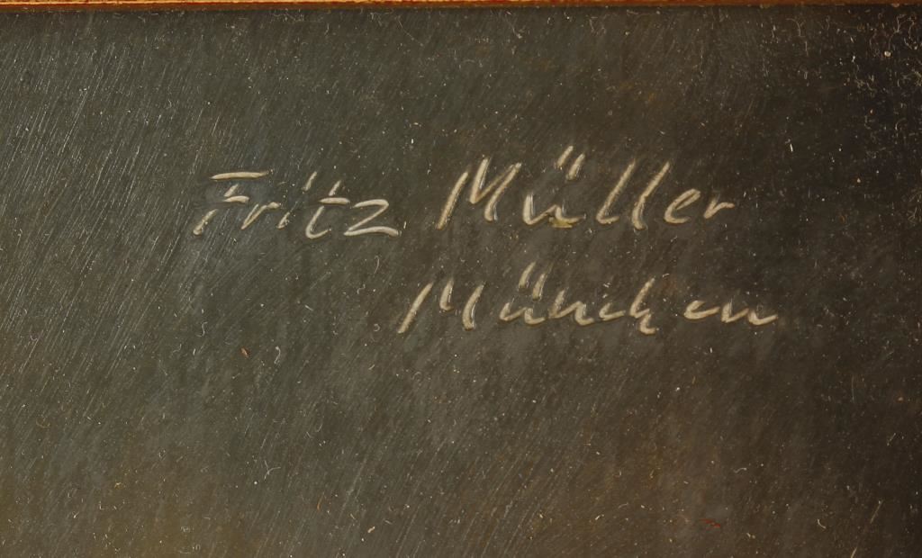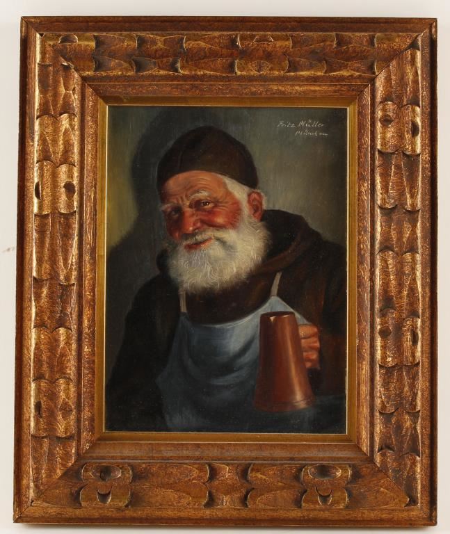 By noted German artist Fritz Mueller depicting a German gentleman with a pint. Signed upper right hand corner. Image size 6-1/2"x8-1/2" in gold frame. From the estate of John Knoblauch noted Western art collector.
