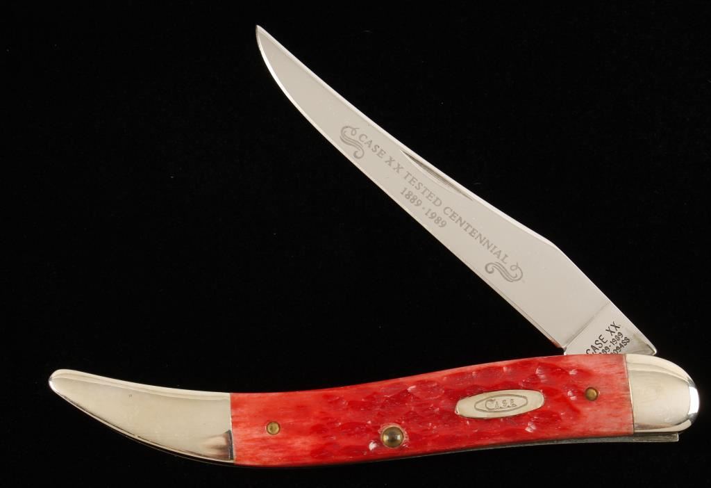 Made in 1989. Stamped "R610094 SS". Handles are red jigged bone or Delrin. Blade is 3-3/8" long and etched with "Case XX Tested Centennial 1889-1989". Condition is excellent.