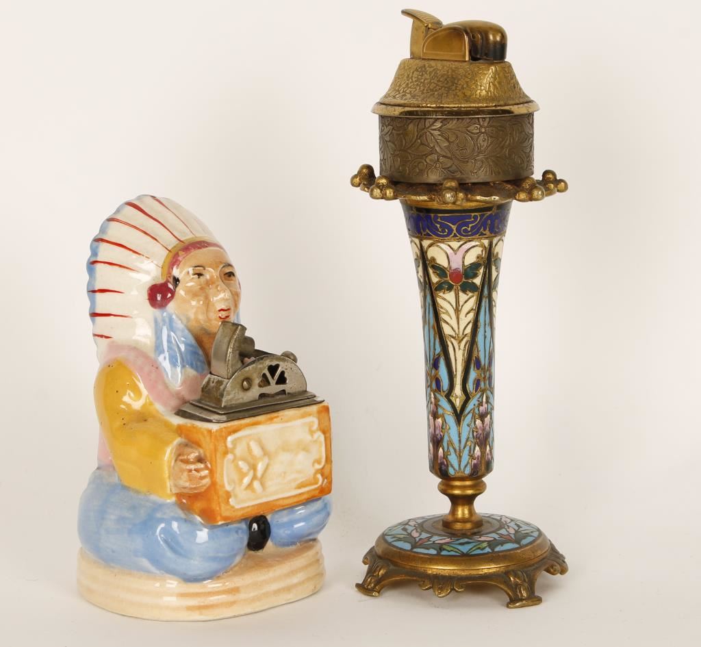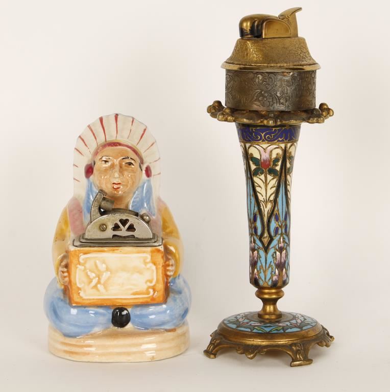 1 Japanese porcelain lighter with Indian chief design 1 Victorian era lighter with cloisonne floral design.