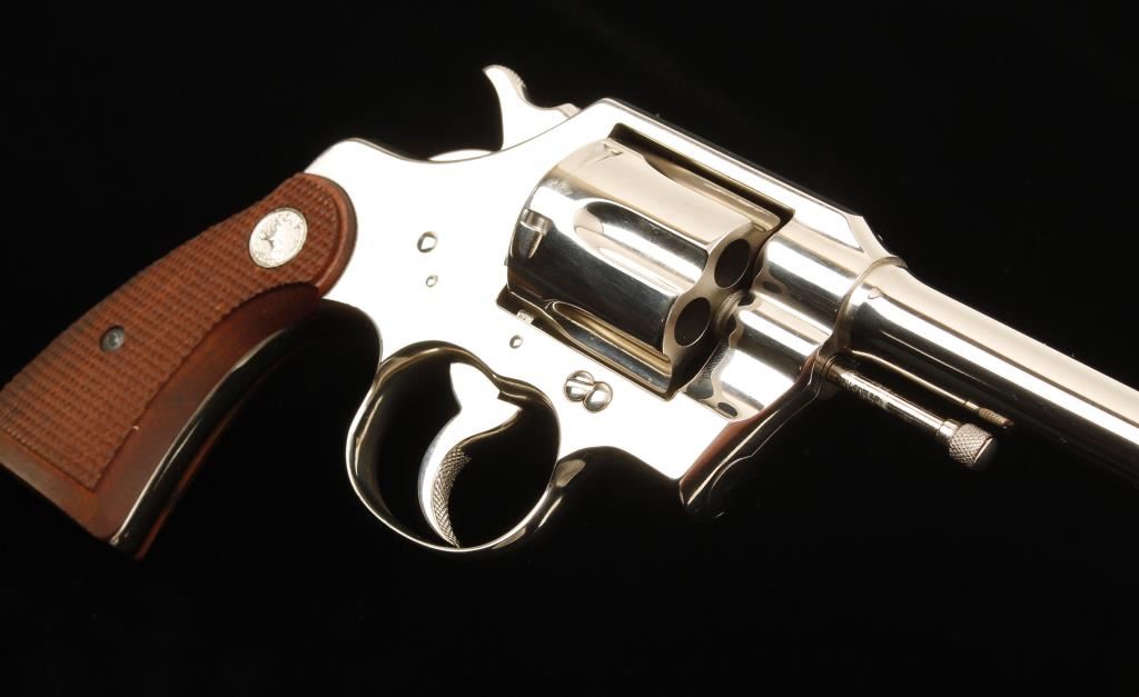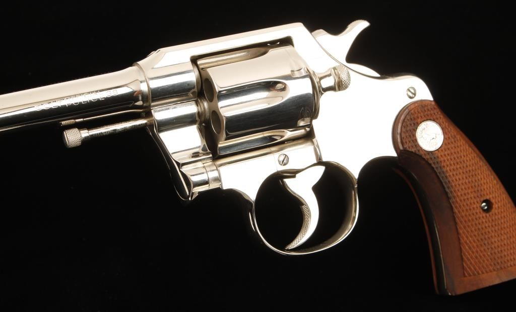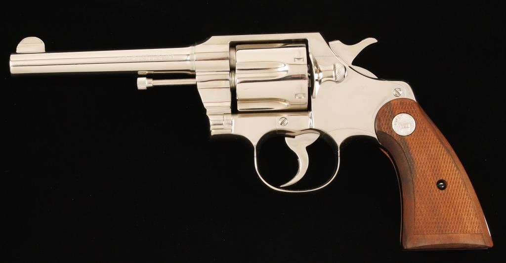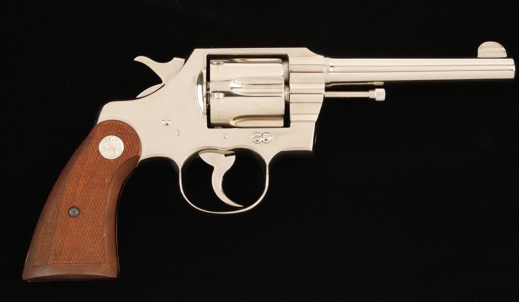 Nickel plated double-action 6-shot revolver with a 5" barrel, fixed sights and checkered wood medallion grips. Made in 1930. Metal finish shows a light drag line, few tiny scratches and rubs and "No. 6483" stamped on the butt. Bore is almost mirror bright with sharp rifling. Chambers are immaculate. Grips are unblemished with sharp checkering. Action is very smooth with solid lock-up. Condition is excellent. *Modern Firearm*