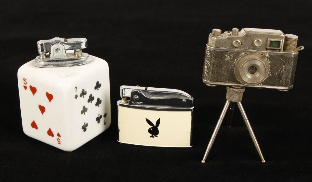 1 Porcelain lighter with card design, 1 with a camera design made by Perfeot Co. and 1 Playboy lighter with bunny logo.