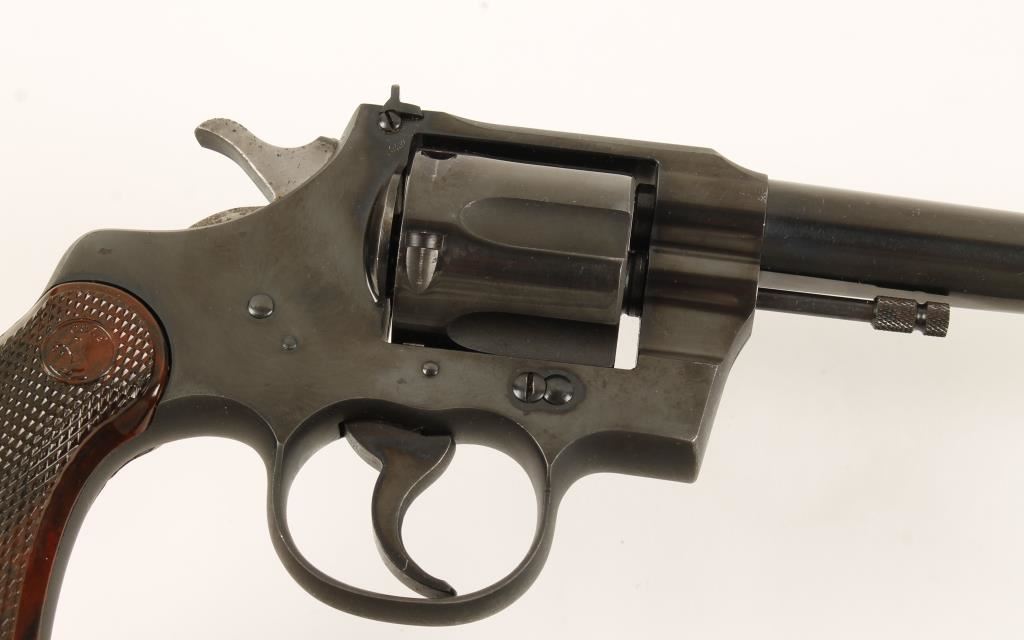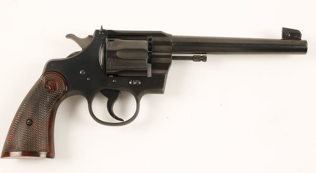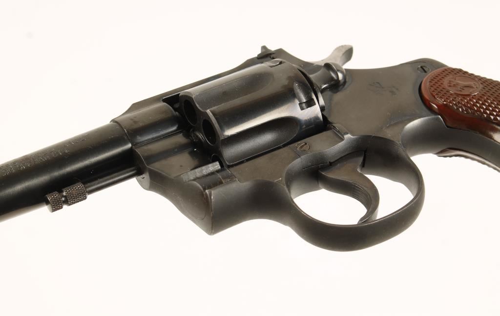Matte and polished blued double-action 6-shot revolver with a 6" tapered barrel, adjustable sights and checkered brown plastic grips. Made in 1950. Metal finish shows a light drag line, few scratches, rubs and scuffs, small areas of surface rust and pin-prick pitting, and more prominent pitting on the back corner of the butt. Bore is mirror bright and chambers are pristine. Action is flawless and the lock-up is solid. Grips are unblemished. Condition is very good. *Modern Firearm*