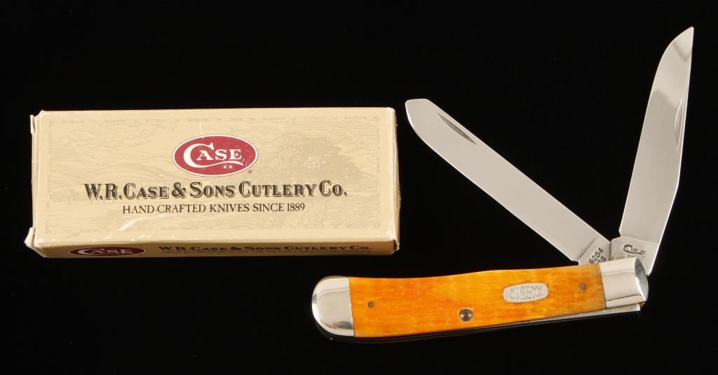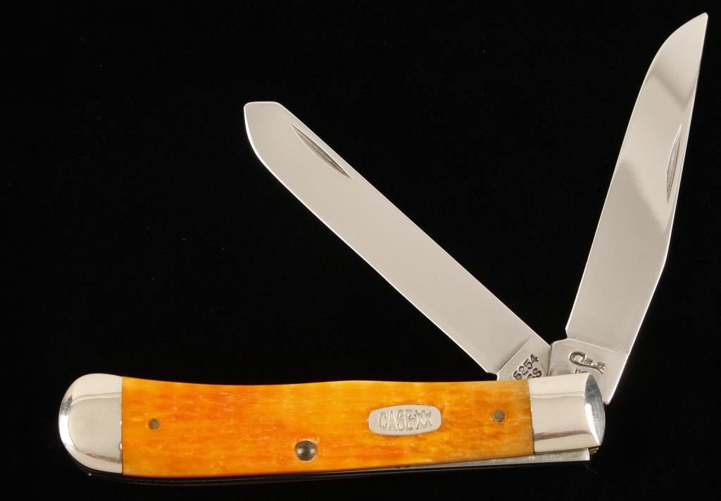 Made in 1996. Stamped "6254 SS". Handles are jigged bone or Delrin in orange. Blades are 3-1/4" long. Comes in a Case box (for a Trapper stamped 6254SSP) with tissue paper and document. Condition is excellent