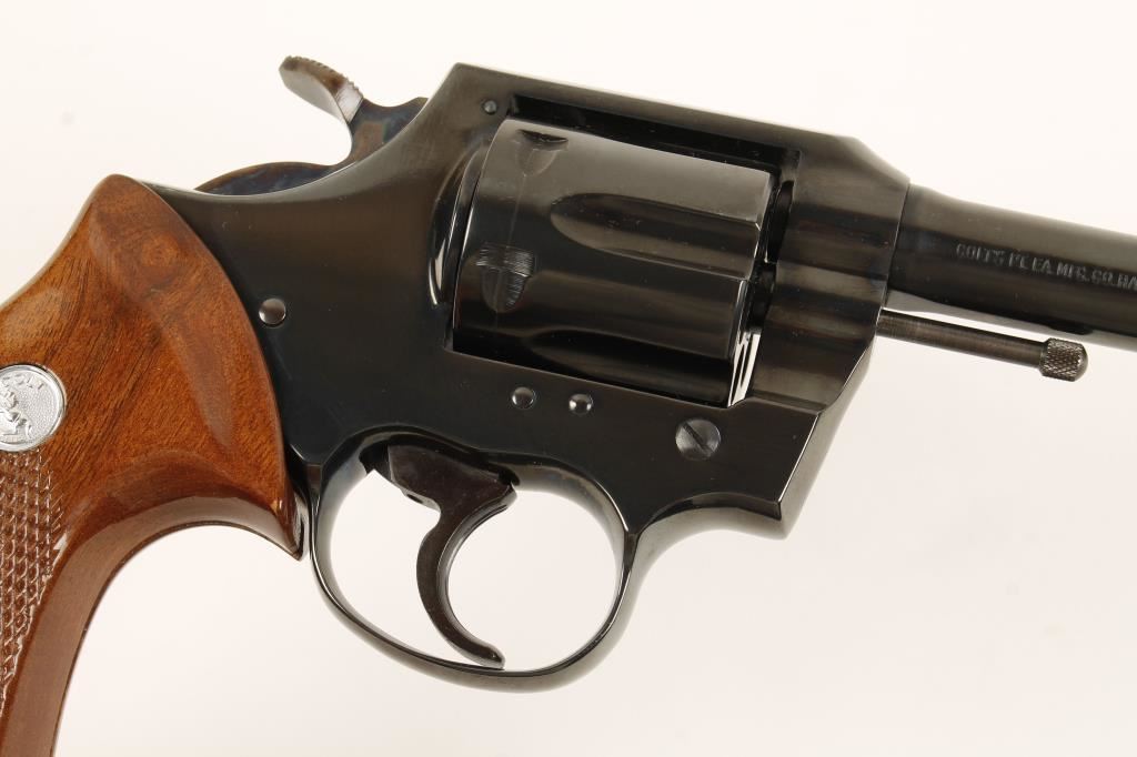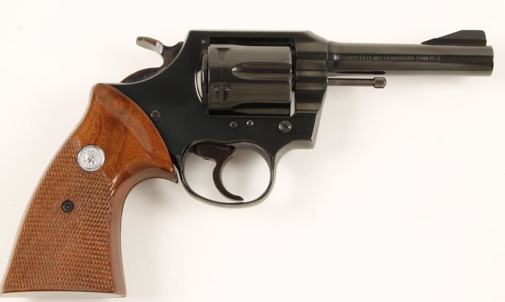 Blued double-action 6-shot revolver with a 4" barrel, fixed sights, case-colored wide spur hammer and checkered wood grips. Made in 1975. Metal finish shows almost imperceptible drag line and a few hair like scratches. The bore is mirror bright and the chambers are immaculate. Action works well and there is a little play in the lock-up. The grips have one rub and scuffs on the bottom. Condition is excellent. *Modern Firearm*
