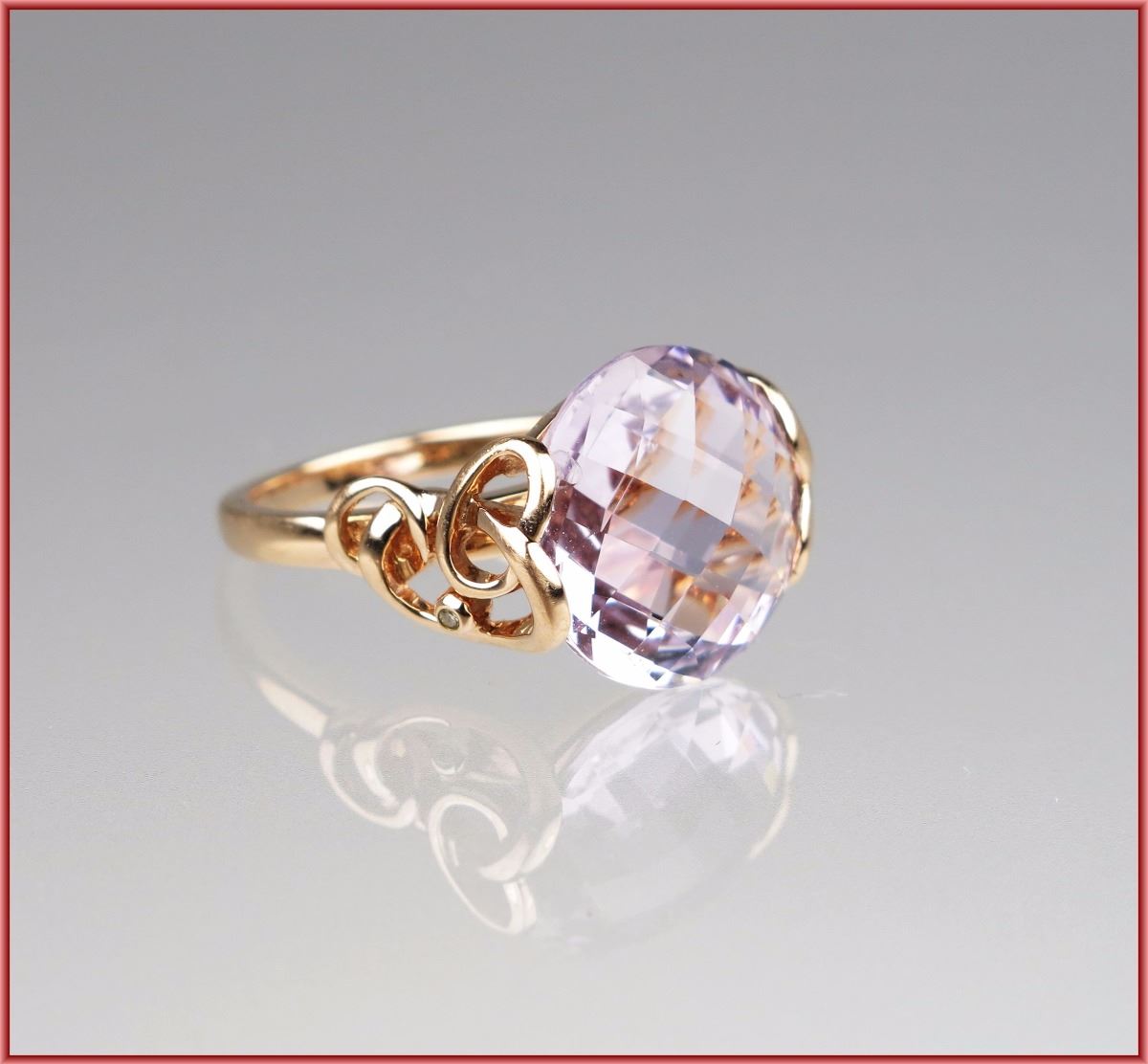 New oval checkerboard cut quartz weighing approx. 7.00 carats set in artistic 14 karat Rose Gold setting with accent diamonds on each side.